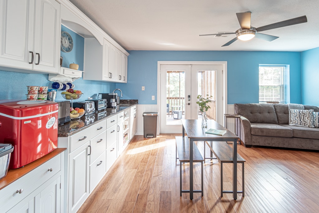 Get away to a limitless Nestled Retreat. This all-in-one level accessible home features a pleasant great room, complete with a queen sofa bed and an open full kitchen. There are two barrier-free bathrooms, two spacious bedrooms, one with a king-size bed and a second with a queen bed. The delightful "Alley Nest", a cottage located in back, can be added to accommodate one or two more guests. Outside, enjoy dining and lounging on the wrap-around porch-fun for all ages and abilities.