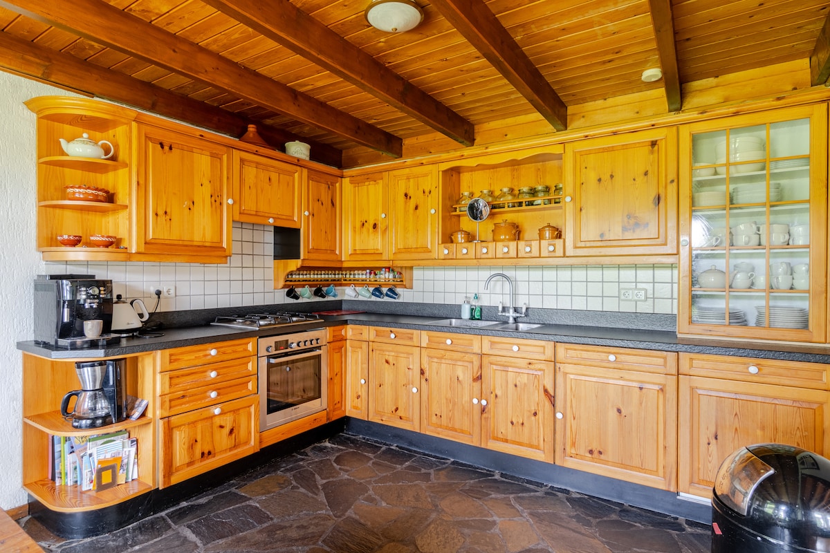 La pintoresca casa de fusta de fusta es troba enmig del bosc. El 2020, la casa de camp es va ampliar completament: moderna, de qualitat i inundada de llum. La nova sauna de barril i la banyera d'hidromassatge del jardí (vs. Càrrec addicional). A causa de les grans finestres del primer pis que mires al camp de golf veí, o gaudeix de la natura verge. La propietat apartada té les millors condicions per relaxar-se fins a 8 persones. [Els nens de fins a 10 anys s'allotgen gratuït en fer la reserva amb acompanyant.]