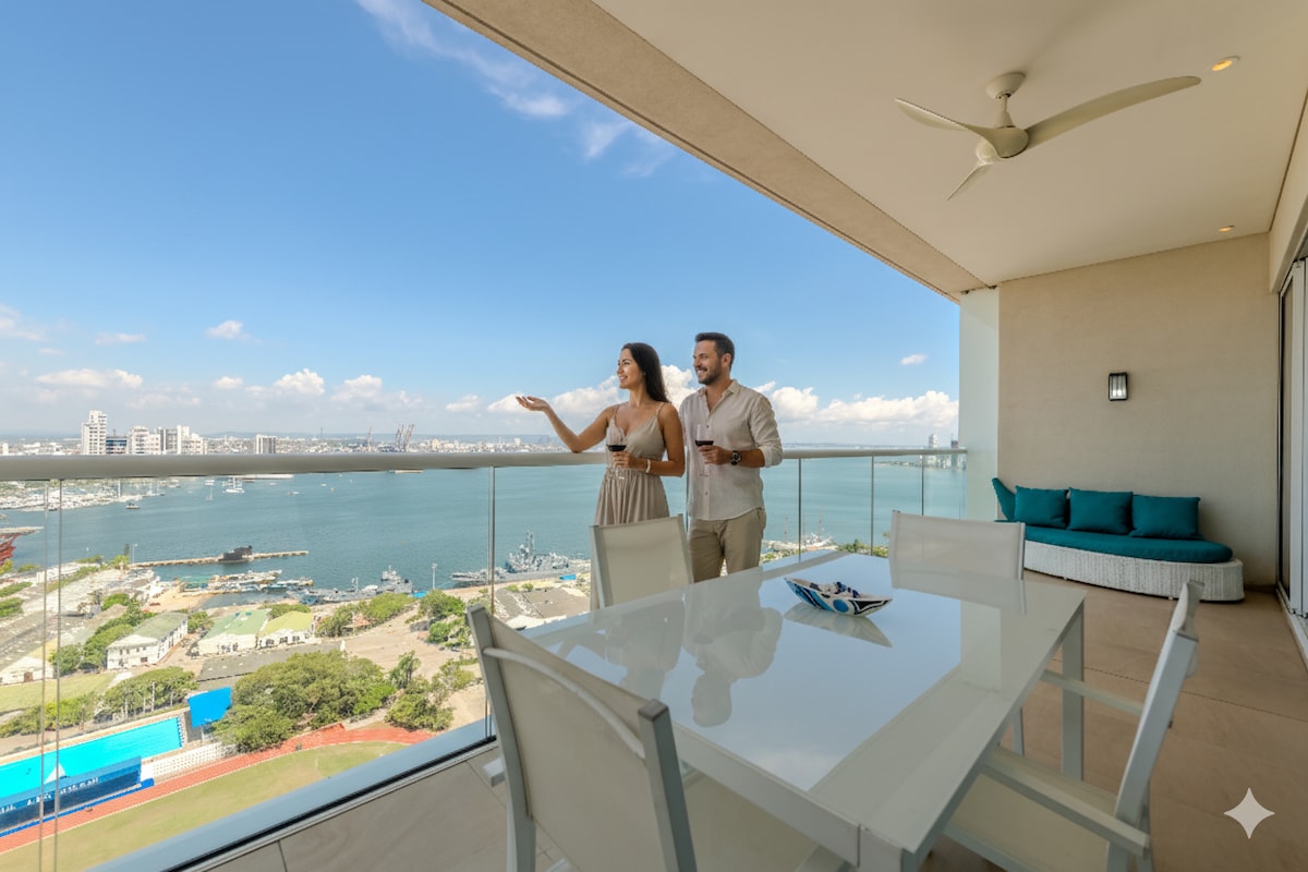 Exclusive 30th floor apartment Morros City with incredible and captivating sea and historic center views. Master bedroom with direct sea view and balcony access. Full kitchen, 2-in-1 washer and dryer, 60" Smart TV, 500MB fiber optic WiFi. Beachfront Bocagrande with luxury amenities: pool, jacuzzi, Turkish bath and gym. Free parking. Ideal for couples seeking the most exclusive experience from the highest available floor in all Cartagena