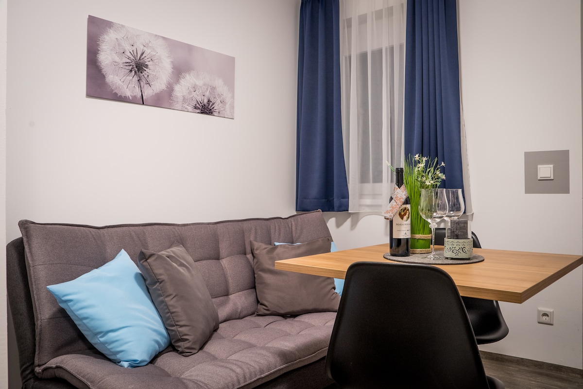 Modern furnished apartment in Straubing with bed linen, towels, hygiene products, bathroom with shower and toilet, also a living room with dining table and fully equipped kitchen. Suitable for 2 adults, available for 3 people on request (request at least 5 days in advance). The two box spring beds can easily be put together as a double bed. A high chair and cot is available if required. Washing machine, dryer and iron are in a common room.