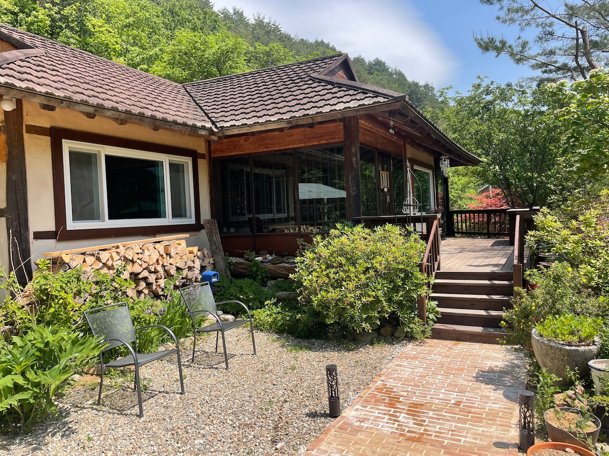Hola Et donem la benvinguda a l'amagatall del bosc. A Hongcheon, Gangwon-do, a una hora de Seül Situat enmig d'un bosc tranquil i tranquil És un hanok saludable construït només amb arbres i argila vermella. La roba de llit i el bidet nets d'estil hoteler estan equipats amb xampú orgànic i gel de dutxa. Hi ha tendes de campanya, cadires i una barbacoa d'alta qualitat al teu propi espai al pati individual davant de l'allotjament. És com venir a una pensió ~ Em sento que estic acampant ~ ~ ^ ^ Omple amb bona gent i records feliços mentre veus les estrelles Pots caminar pel camí del bosc amb la escala que comença al pati. Pots quedar-te quiet i mirar les muntanyes, els arbres, el cel i els núvols. Et donem un autèntic descans Et donem la benvinguda. Aquest és el teu propi amagatall forestal.