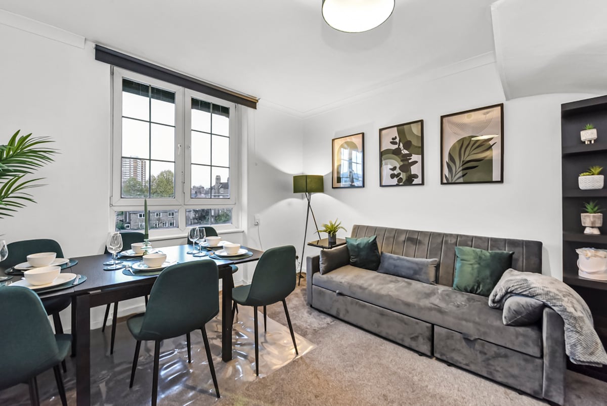 🏠El nostre ampli pis està situat en un lloc ideal per explorar el centre de Londres i el mercat de Borough. 🚶A menys de 10 minuts de les estacions de metro de Southwark i Borough, estàs a prop de les principals atraccions com Borough Market, The Shard i London Bridge, i d'una gran varietat de restaurants, cafeteries i botigues. 🛌Ampli allotjament amb 2 habitacions i 1,5 banys amb llits còmodes i un espai acollidor. Cuina totalment equipada, que ofereix tot el que necessites per fer que la teva estada sigui còmoda i per sentir-te com a casa.