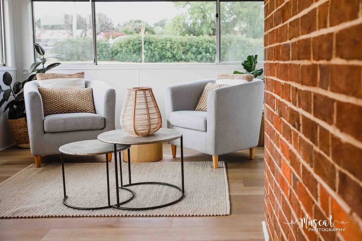 Enjoy a stylish experience at this centrally located place. The perfect couples’ escape. A cozy living room with leather lounge, heated throw, electric log fireplace and RC A/C. The kitchen has a full sized fridge with freezer, dishwasher, microwave, kettle, toaster, coffee machine and air fryer. A lux boudoir features a king bed with electric blanket, built-in robe and TV. Large bathroom with freestanding tub and twin shower. Separate WC. Private alfresco with BBQ, sink, washer and dryer.