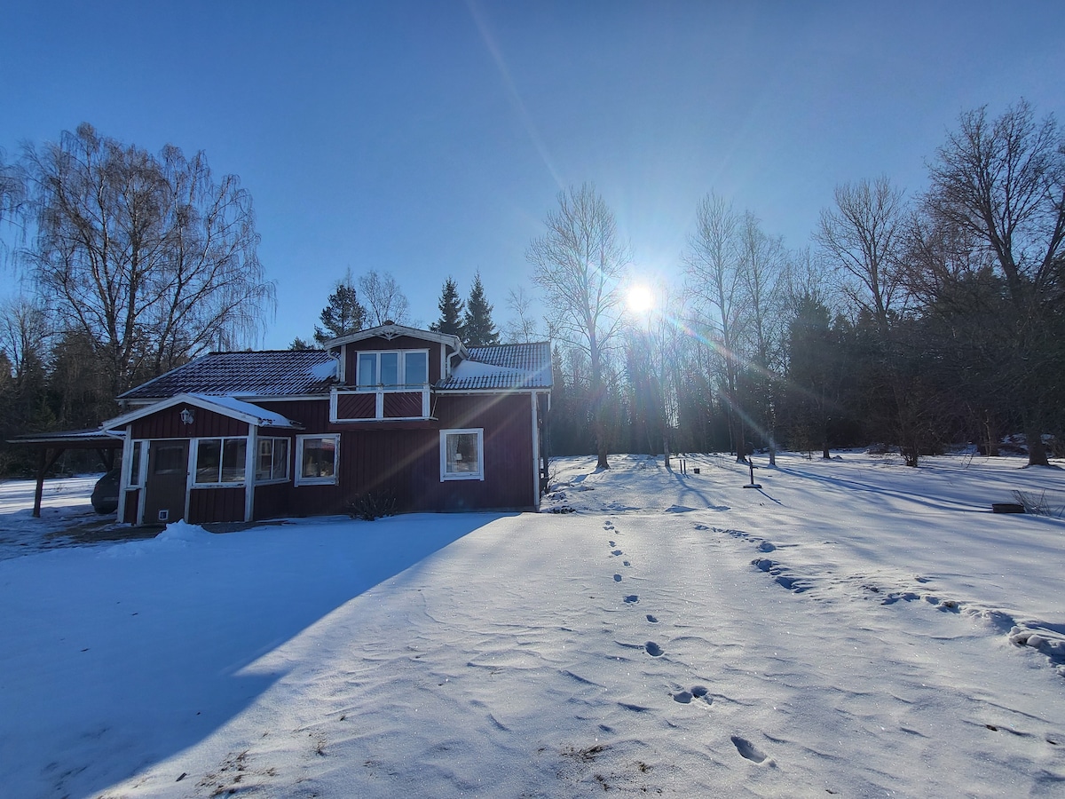 Ett nybyggt hus på landet, stor lägenhet övre plan på 140 kvm med öppen planlösning. Huset ligger på en gård med skogen bakom knuten och en stor trädgård med gräsmatta. Lägenheten har alla bekvämligheter som fullt utrustat kök, badrum med wc/dusch och tvättmaskin. 4 bäddar (dubbelsäng+bäddsoffa) Är ni fler i sällskapet finns det plats för egen madrass alt. barnsäng. Några hundra meter bort finns ett vindskydd med grillplats vid en damm. Vedeldad bastu intill grillplats kan hyras mot tillägg.
