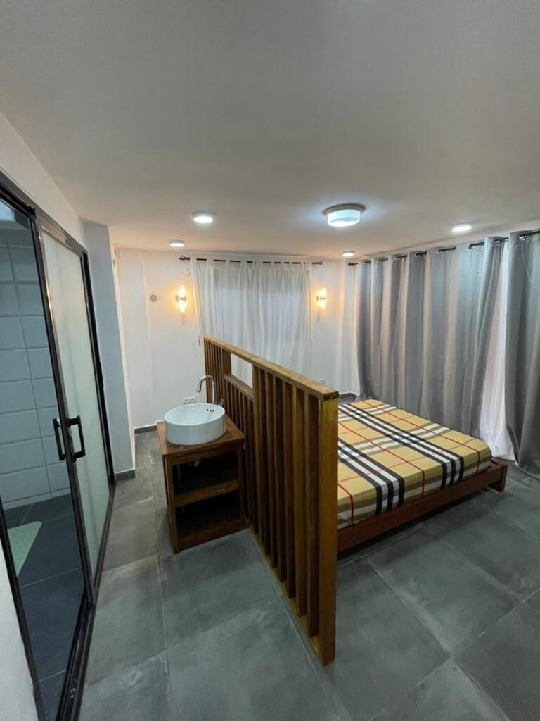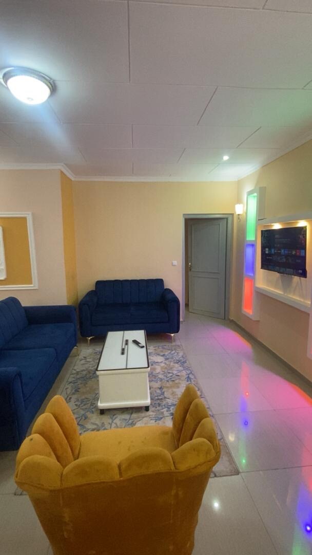 Aquest apartament modern a Poto-Poto, Brazzaville, ofereix estil i comoditat. La sala d'estar és lluminosa i inclou un sofà de cuir, una televisió intel·ligent i una decoració elegant. Les grans finestres aporten llum natural i l'aire condicionat garanteix una estada fresca. Perfecte per a viatgers de negocis o parelles, aquest espai elegant ofereix una experiència prèmium al cor de la ciutat.