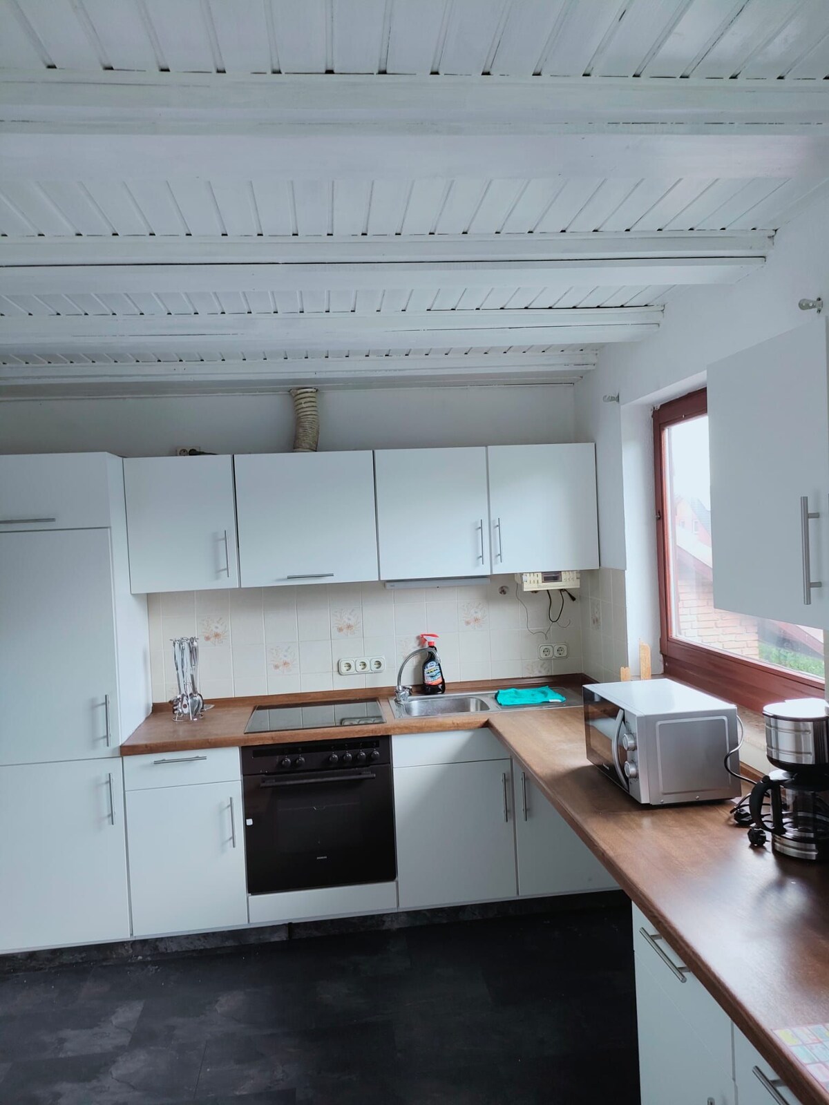 Unsere Gäste haben die obere Etage mit 90 qm für sich allein. Über eine kleine zweite Haustür gelangt man nach oben. Es gibt dort eine Wohnküche mit einem Einzelbett, ein großes Schlafzimmer mit 160 cm Doppelbett, ein weiteres Schlafzimmer mit 140 cm Doppelbett, das Kaminzimmer, einen kleinen Balkon und ein Bad mit Wanne und Dusche. Im EG wohne ich mit meinem Freund und unseren 3 KATZEN, ich kann nicht ausschließen, dass die 3 Fellbewohner Euch mal besuchen, falls ihr die Tür offen habt.