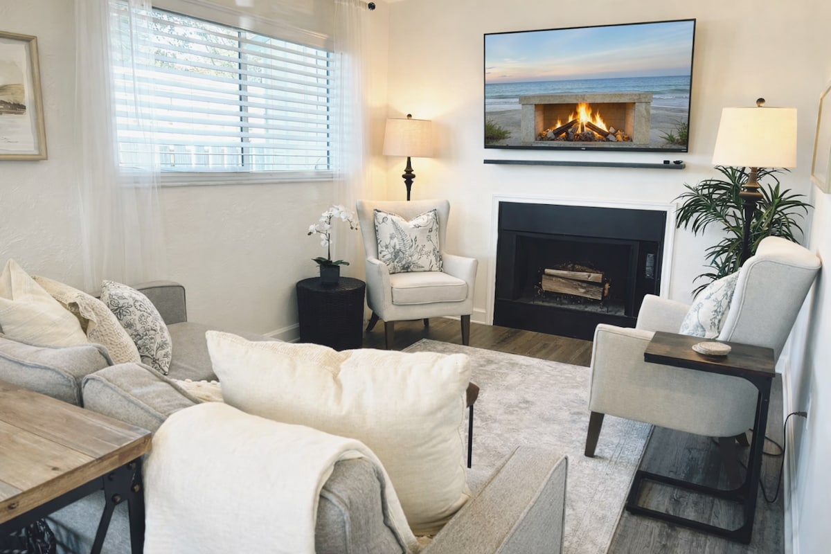 Casa lluny de casa 🌊 Encantadora casa de 2 dormitoris a peu de platja amb 3 espais a l'aire lliure i gimnàs privat, a uns passos de la costa! Aquesta acollidora casa de 2 llits i 1 bany ofereix un pati privat tancat, tres zones exteriors (una coberta), una llar de foc i un gimnàs amb aire condicionat. Gaudeix d'un televisor intel·ligent, wifi, un Keurig i una cuina totalment equipada. L'allotjament inclou 3 llits, 1 sofà llit, una rentadora/assecadora i una graella de gas. Bonus: dues bicicletes de platja, una taula de surf i equipament de platja per a la teva escapada perfecta.