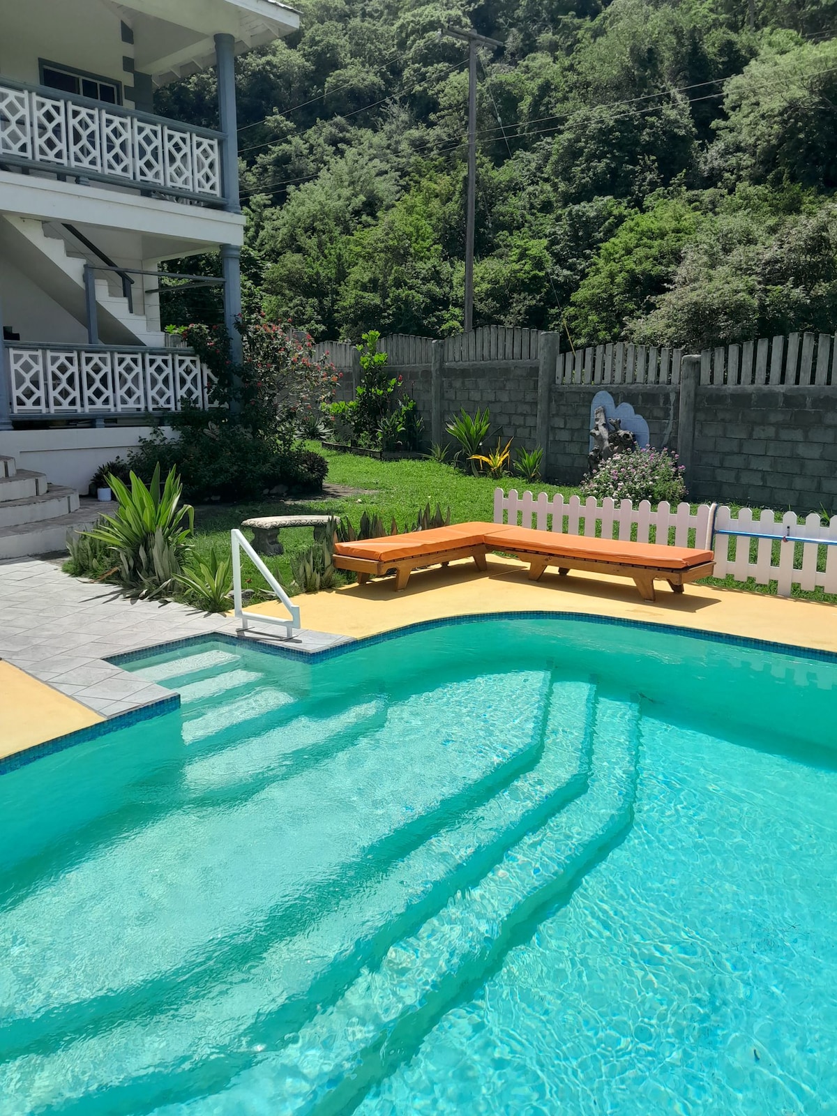 Aquest colorit apartament té a veure amb les vistes del "milió de dòlars". Amb 100 esglaons a través de jardins madurs fins a una natació segura a Blue Lagoon. Un estudi amb aire condicionat en un jardí assolellat que consta de cuina americana, bany, dormitori i terrassa privada. Hi ha vistes panoràmiques sobre la llacuna blava i vistes tant al mar Carib com a l'oceà Atlàntic fins a les Granadines. Tingues en compte que no es permeten reserves per a nadons o nens a causa de la ubicació del penya-segat.