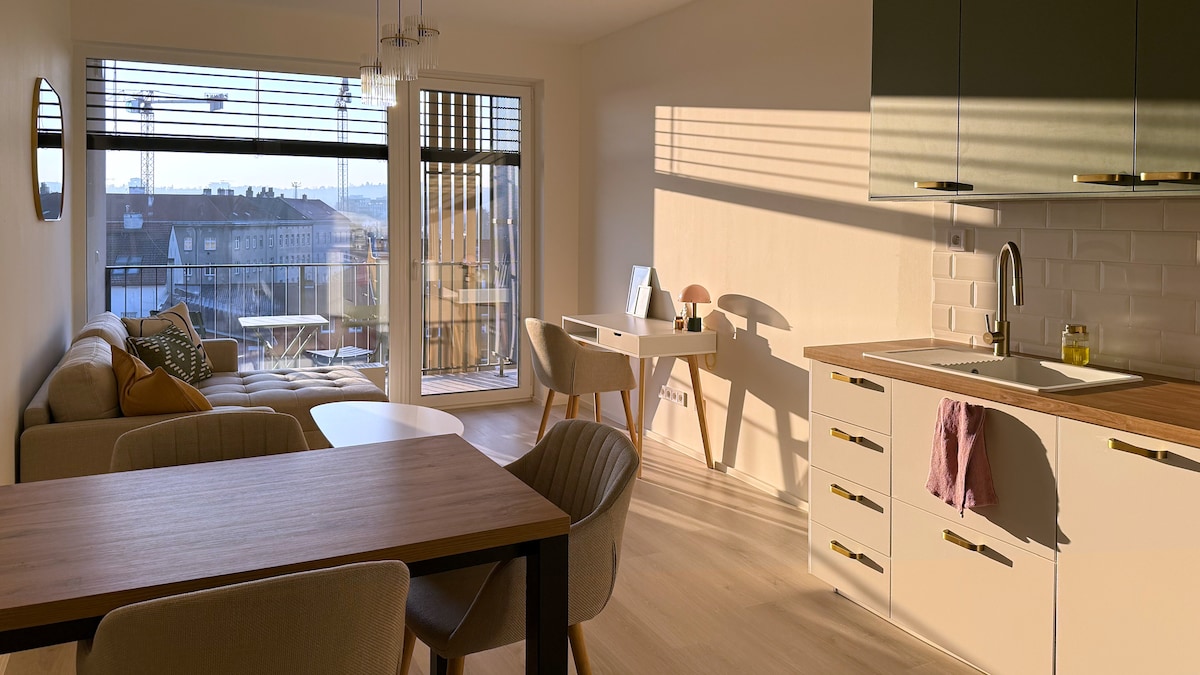 Gaudeix d'una experiència emocionant en un pis nou i espaiós amb una vista única des de la seva gran terrassa. Està a només 10 minuts en tramvia del centre de Brno. És ideal per a parelles, famílies amb nens o viatgers de negocis. Apreciaràs la sala d'estar espaiosa i moderna amb detalls elegants. Gran terrassa amb una graella de carbó, gandules i les increïbles vistes que faran que la teva estada sigui molt més còmoda. Tot l'apartament té aire condicionat.
