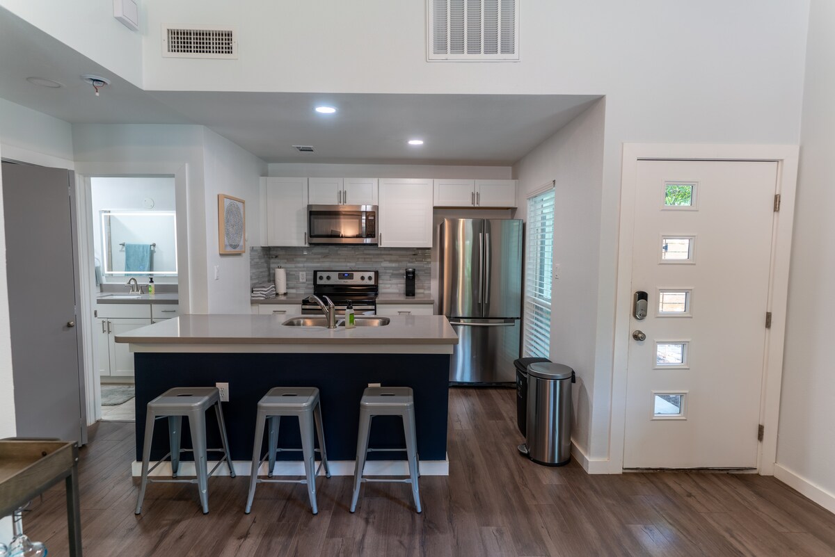 Aquest luxós apartament de dues plantes en un complex de quatre pisos ha estat remodelat recentment amb els més alts estàndards i té una ubicació ideal a S. Lamar, a prop de Zilker i del centre de la ciutat. Amb un disseny espaiós de planta oberta, l'allotjament disposa d'una gran cuina de cuina, un luxós dormitori principal amb llits «king size», llits individuals i llits plegables. Així com banys a cada planta i un pati. Es poden permetre animals de companyia de menys de 50 lliures amb un dipòsit reembossable de 175 $. Sol·licita'ns-ho abans de fer la reserva.