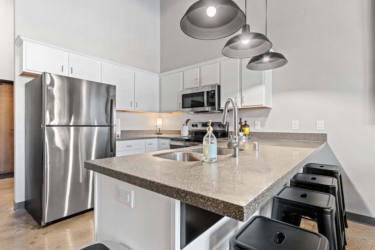 Enjoy this stylish, 3-bedroom, 2 bath downtown loft. This rare find has it all: city views, soaring ceilings, modern decor, & fully equipped kitchen. Kick back on our sprawling sectional, tune in to the game on our 60” Hisense TV, or cozy up with a book in front of our electric fireplace in the loft. This modern space boasts a king, queen, (2) twin beds, & in-unit washer/dryer combo. Enjoy free access to our community room, rooftop patio, and gym. FREE shuttle to/from Lambeau on game day.