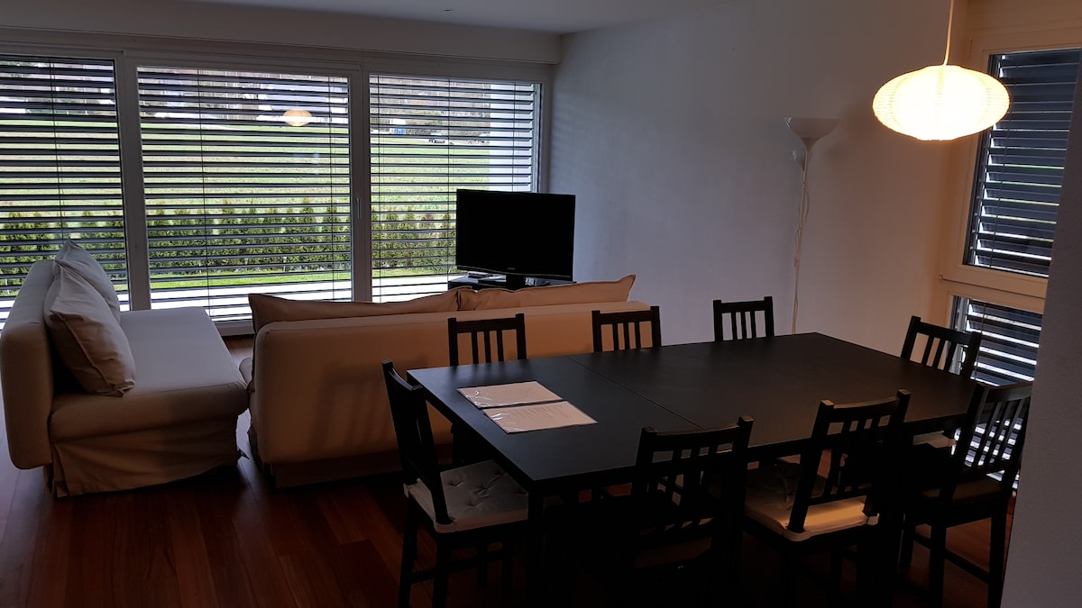 Preciosa vista orientada al sud dels camps i la ciutat. 150 metres quadrats. Cuina moderna. Ampli aparcament. A 100 metres de l'estació de tren amb 2 trens directes a Zuric cada hora. Els 4 dormitoris són de diferents mides: un dormitori gran, 2 de mitjans i 1 petit. Cada dormitori té 2 llits individuals i la sala d'estar té 2 sofàs llit. Es poden allotjar 2 persones més en matalassos de terra (col·locats a la sala d'estar o a l'habitació gran). En alguns dels dormitoris, els llits es poden ajuntar si es desitja.