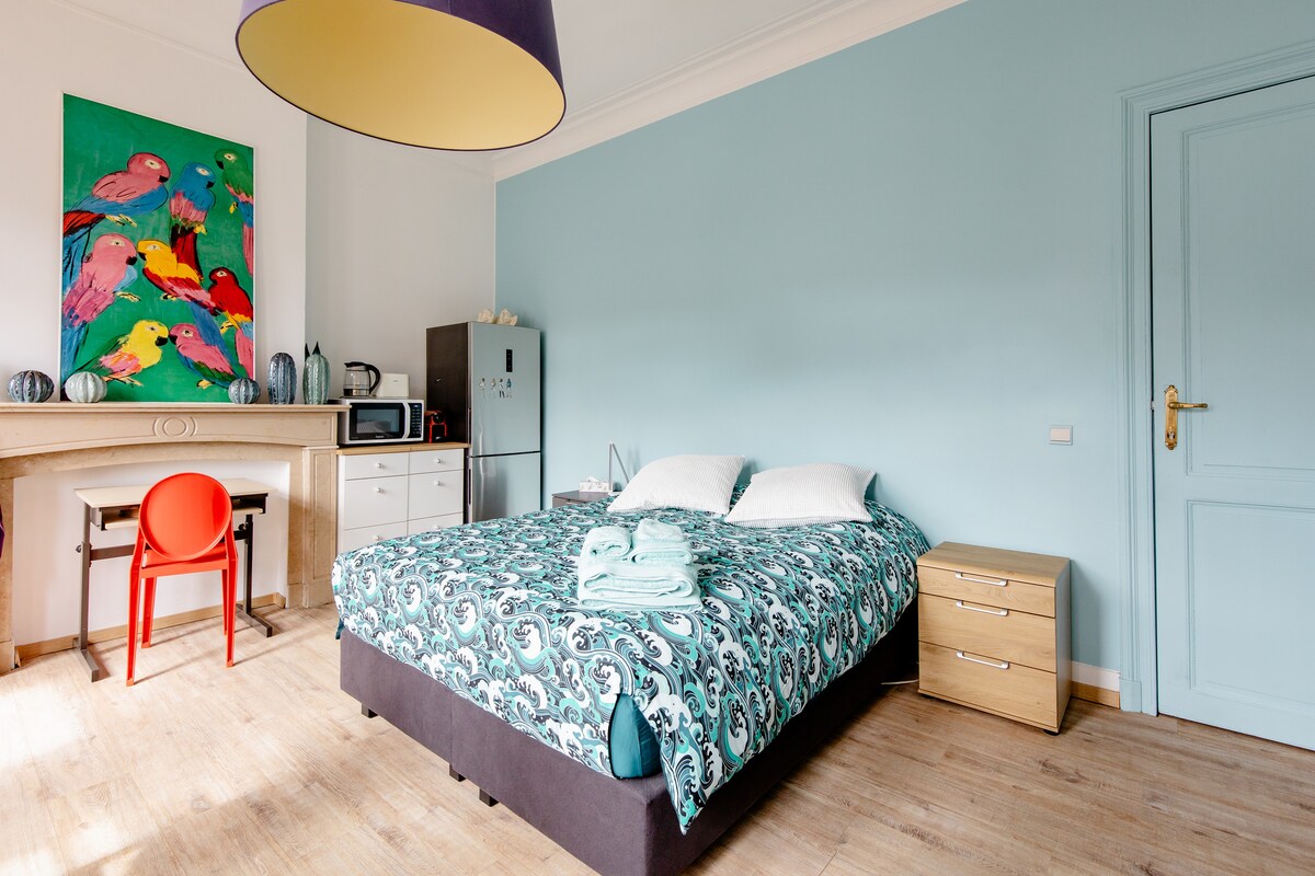 Preciós estudi lluminós i tranquil en una casa familiar a les afores de Bxl, però a prop del transport públic (15'a peu). Resto 's, supermercat, perruqueria, farmàcia ,... a prop (<1 km) Plaça d'aparcament privada. Possibilitat de gaudir d'un espai al jardí amb una taula i 2 cadires. el nostre netejador ve tots els divendres. Si vols, pot netejar l'estudi i canviar els llençols i el La piscina es lloga (amb càrrec addicional) en funció de la disponibilitat.