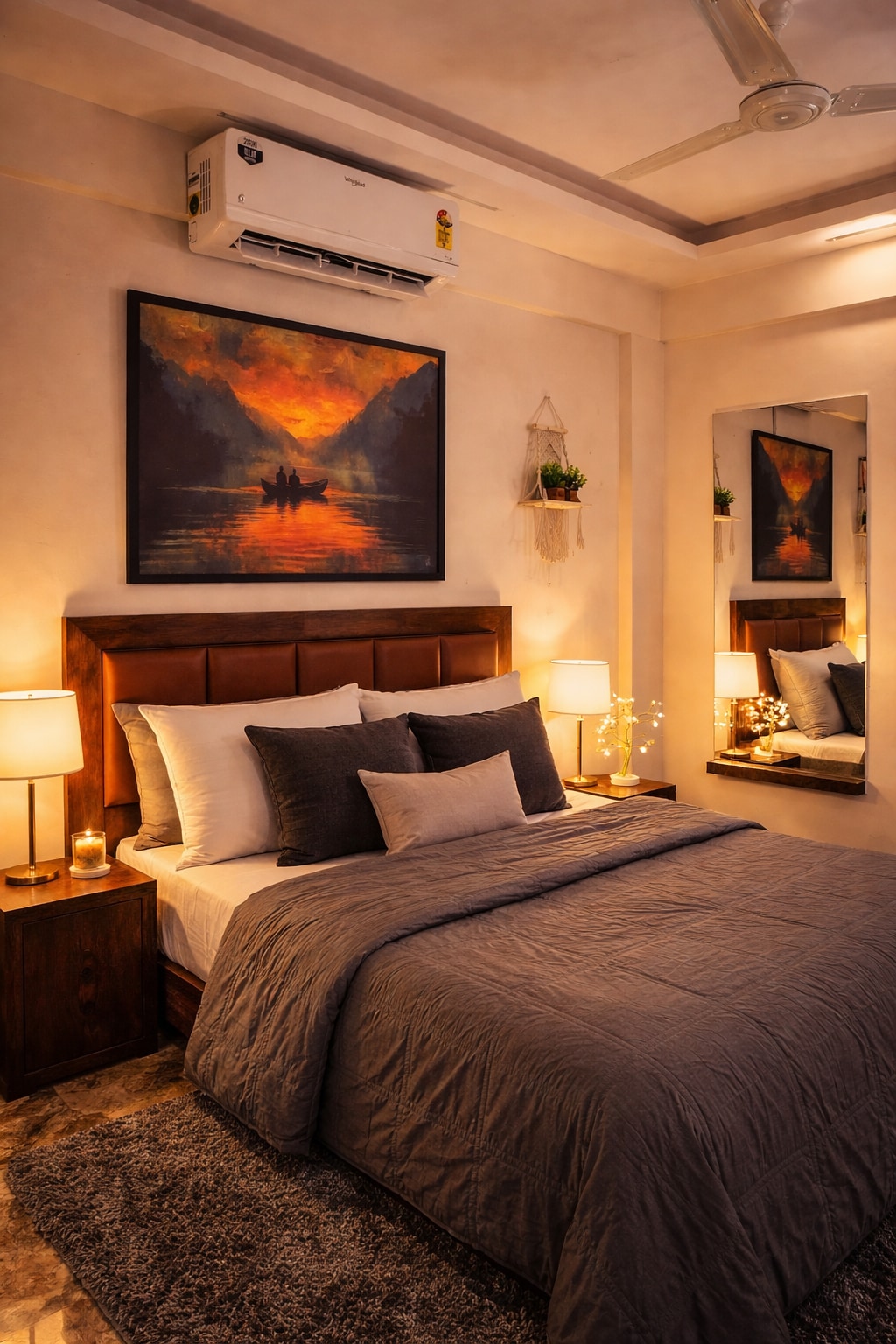 A warm beige-toned studio with an old-world rustic charm, inspired by the calm, earthy feel of traditional homes. The space has large openings and great ventilation, allowing plenty of fresh air and sunlight to flow through the room. Its slightly aged, haveli-style character adds a nostalgic touch, making it feel cozy and lived-in rather than modern and polished. Step out to the terrace to enjoy open skies, quiet mornings, or relaxed evening.