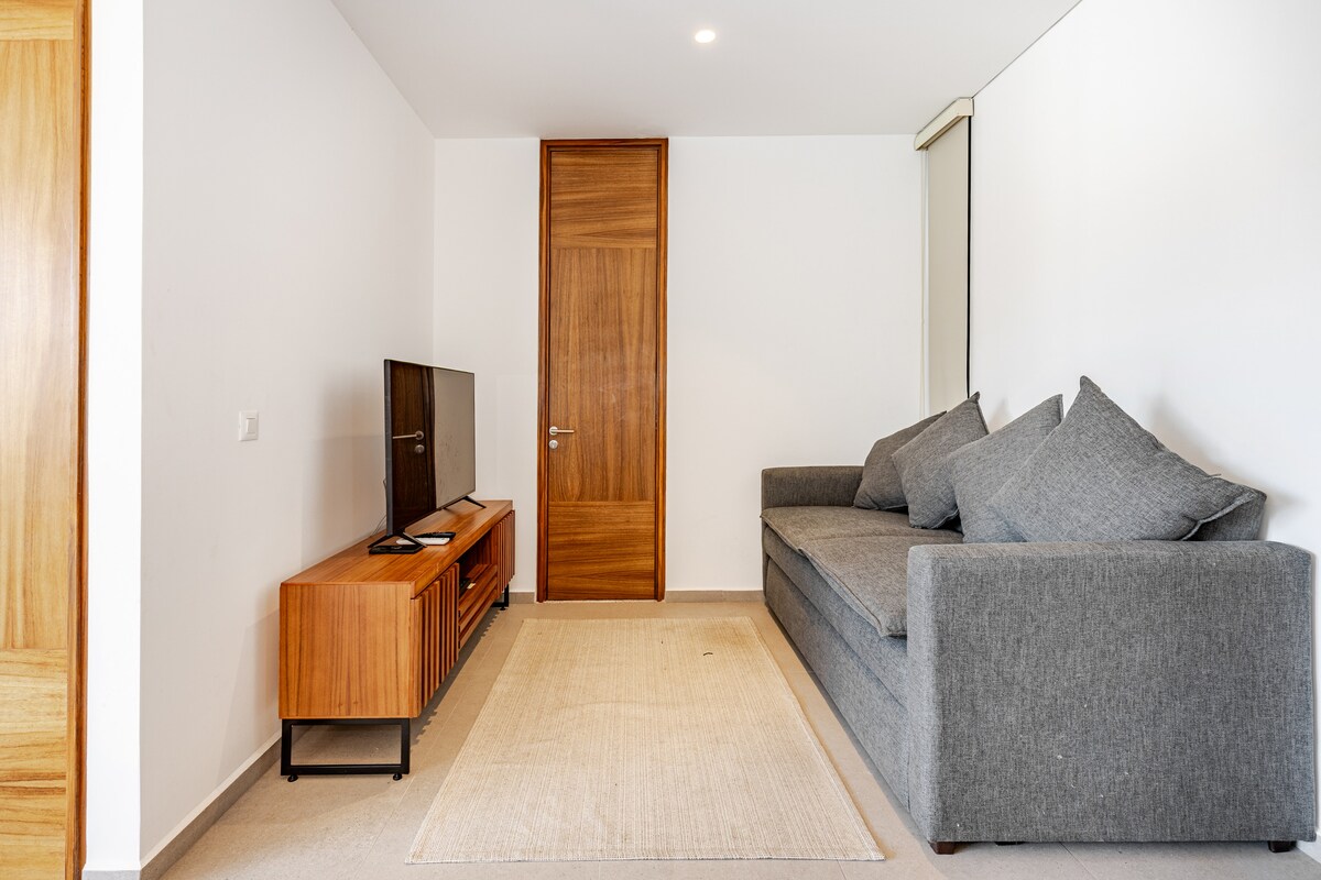 Condo Rosina is a freshly updated 1-bedroom condo on the 4th floor of 3.14 Living in Nuevo Vallarta repainted in June 2025. Enjoy mountain views and a cozy balcony with BBQ and sunrise view. Sleeps 2 with a king bed, 1 bathroom with shower, fully equipped kitchen, coffee station, high-speed internet, great new A/C, and a dedicated workspace. Spacious living area with large couch. Walk to the beach in 8 minutes or enjoy cafés, restaurants, and shops just downstairs. Peaceful and well located.
