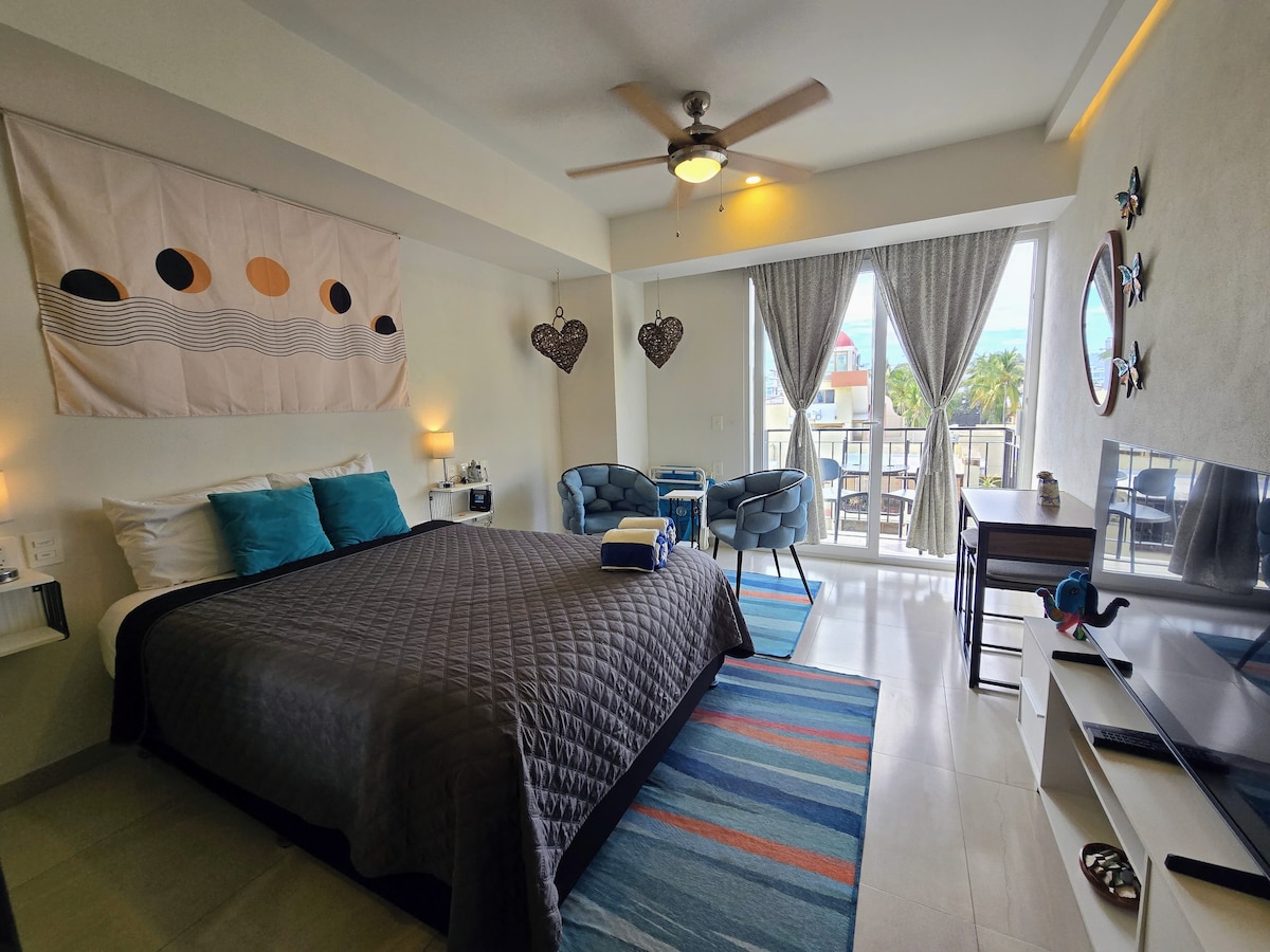 Et donem la benvinguda al teu relaxant refugi al cor de Bucerías! Aquest elegant dormitori d'1 dormitori està a només una illa de la platja i a uns passos de la plaça principal. Piscina al terrat amb vistes impressionants. L'espai inclou una cuina totalment equipada, un espai de treball i una connexió wifi ràpida per a la teva comoditat. Tant si ets aquí per prendre el sol o explorar l'encant local, aquest apartament ofereix la base perfecta per gaudir d'una estada inoblidable. *Consulta l'avís legal sobre el soroll de la construcció a continuació