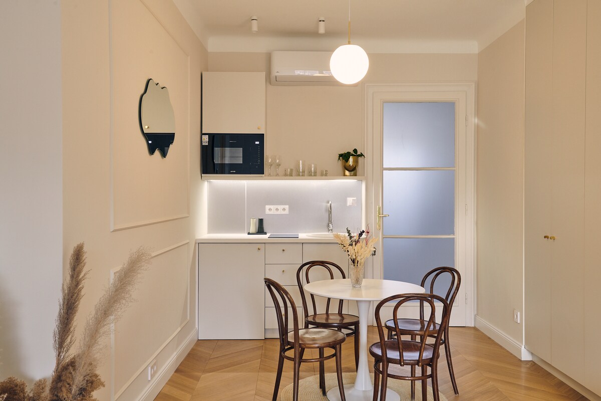 L'elegant apartament d'un llit enorme de 75 metres quadrats ha estat totalment renovat amb un disseny elegant en una casa preciosa de mitjans de segle. L'apartament es troba a la tercera planta amb ascensor en una zona molt tranquil·la de l'edifici. Situat en una de les zones més de moda de Budapest, amb els millors bars, pubs, restaurants, galeries, botigues de roba de disseny, botigues i arquitectura històrica a la teva porta. L'apartament té un dormitori, una sala d'estar, cuina totalment equipada i un bany.