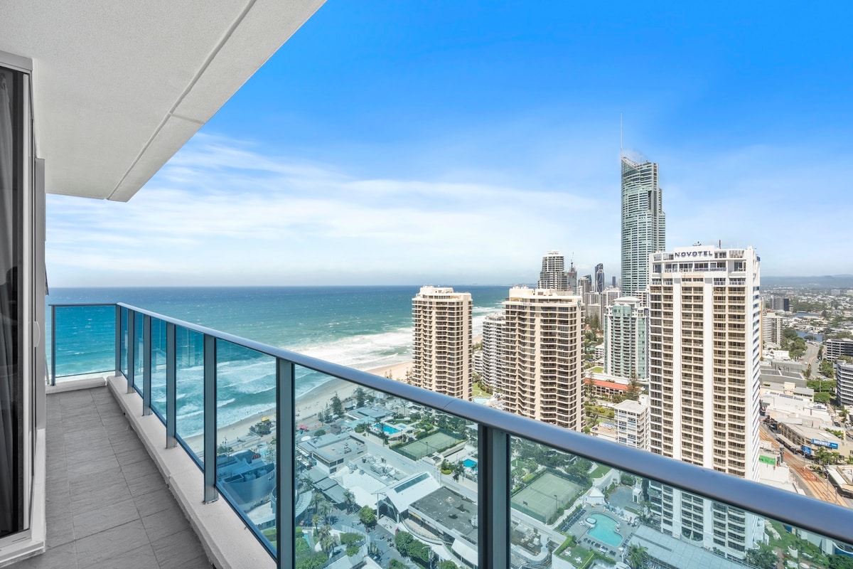 Direct ocean and city views from this brand new luxury 2-bedroom, 2-bathroom corner apartment. You will be high in the sky on level 60+. The unit is complete with FREE PARKING in the buildings gated underground car park. Absolute beachfront location at the newest building in central Surfers Paradise. The unit is equipped with everything you will need for your stay including fast 5G WiFi and more! Enjoy the heated indoor & outdoor pools, spa, sauna, gym, restaurants, and cafe!
