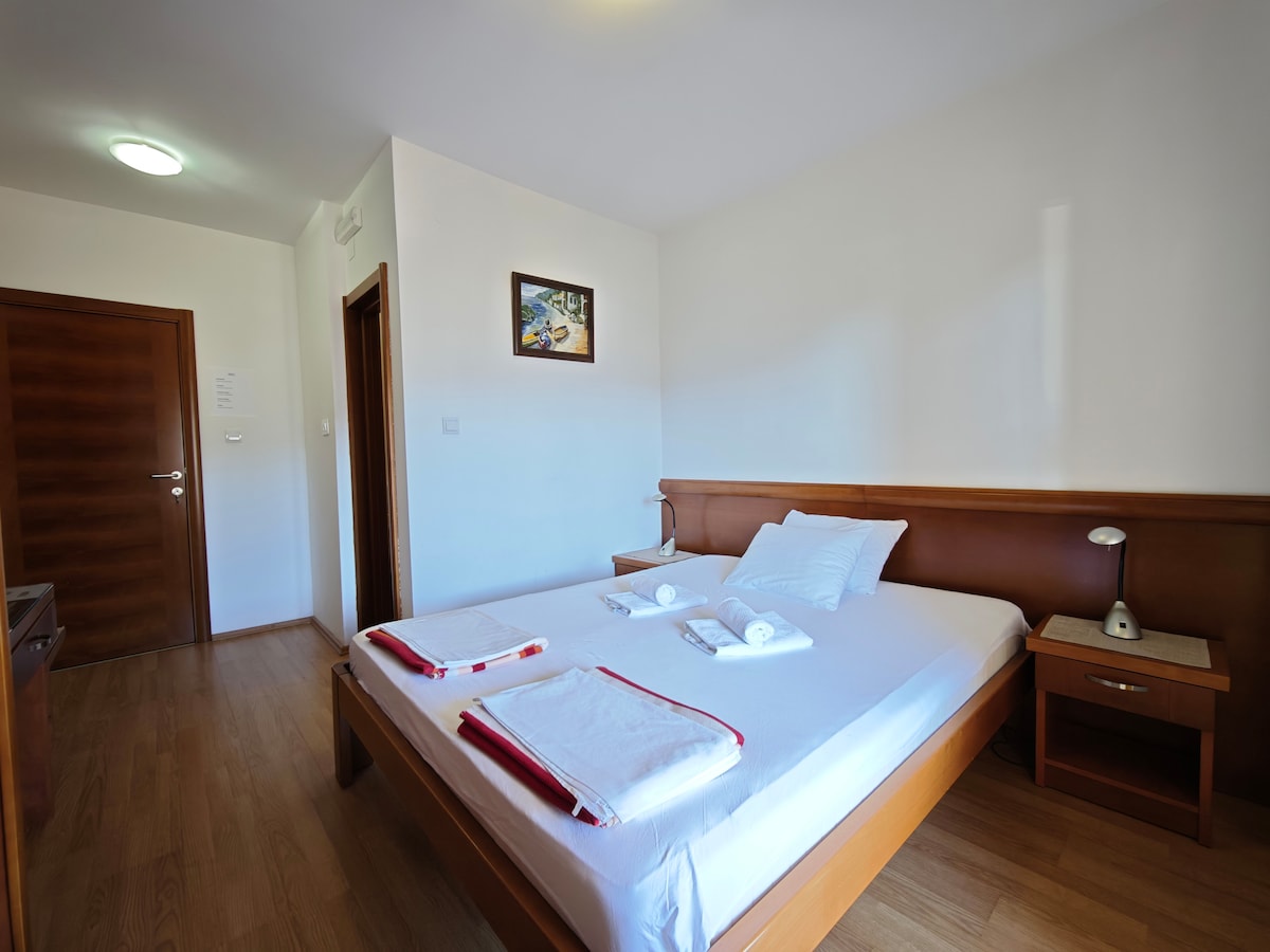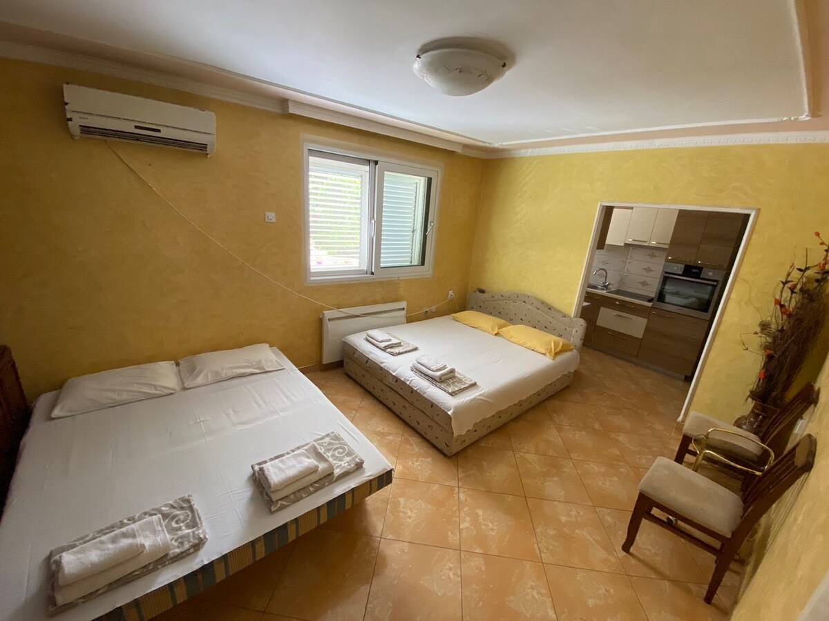 Aquesta suite està situada al centre de Budva. Només es tarda 5 minuts a peu a la platja i 10 minuts al nucli antic i a l'estació d'autobusos. A la zona de 200 m hi ha supermercats, cafeteries, restaurants, farmàcia, centre comercial i el mercat principal. Dins de l'apartament t'oferim 2 dormitoris i bany. El dormitori principal té un llit doble, cuina equipada, taula de menjador, TV i aire condicionat. El segon dormitori té dos llits individuals i surt al balcó. Wifi gratuïta. Aparcament gratuït.