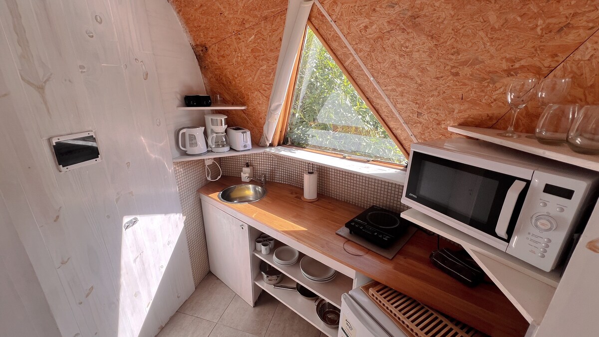 Et convido a descansar en una cúpula que he pensat i construït en detall, per tal que allotjar-te aquí sigui una experiència preciosa i nova. Sigui quina sigui l'època de l'any, sempre hi ha alguna cosa especial i única per fer: gaudir de la platja, passejar, llegir una petita prestatgeria, passejar en bicicleta o refugiar-se a l'interior, amb un petit niu il·luminat mirant les estrelles per una de les 18 finestres que t'envolten. Un ambient càlid i tranquil que sens dubte triaràs per tornar.