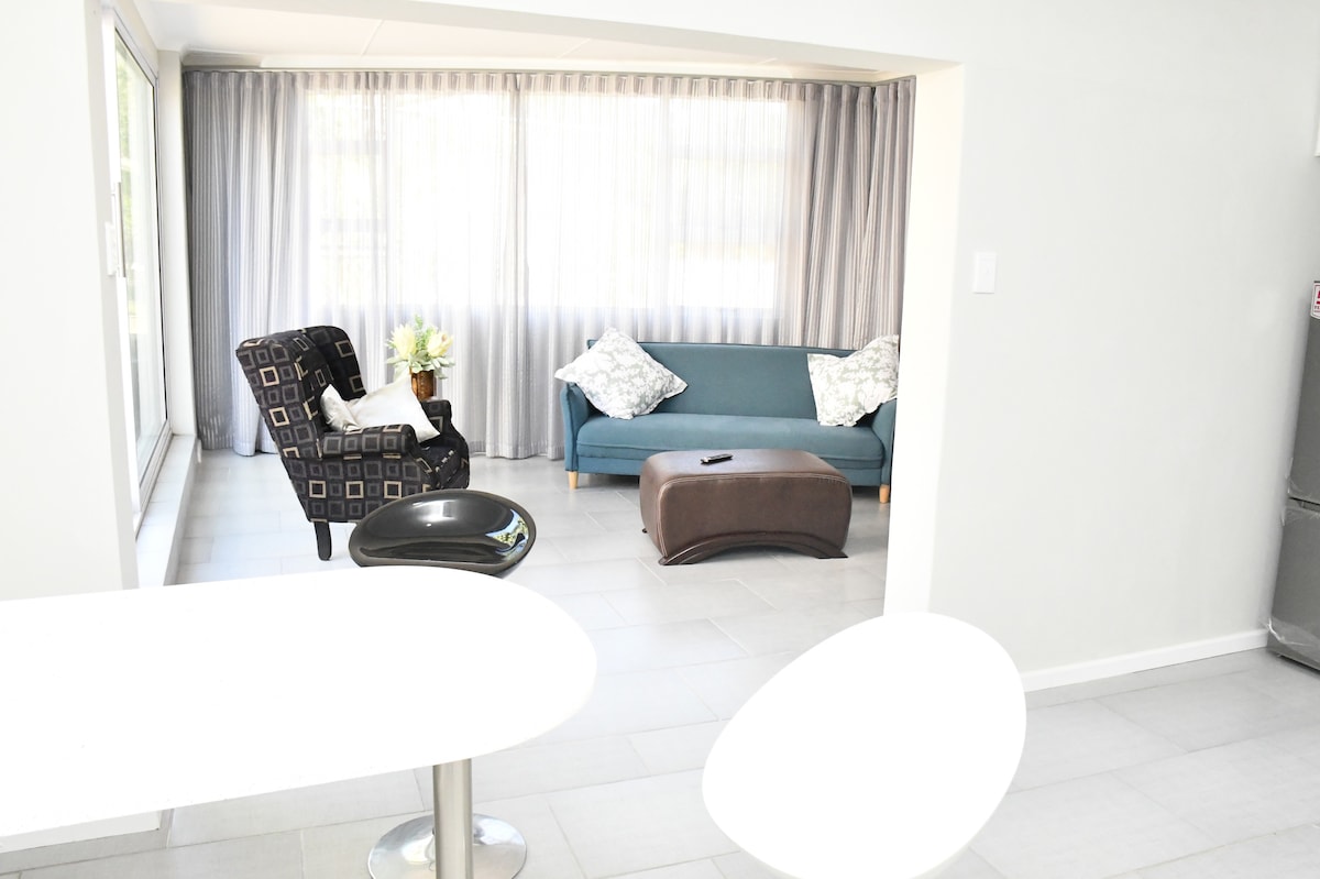 Pis estudi modern i espaiós. Tot equipat, ideal per a viatgers de negocis o parelles de vacances. És segur amb aparcament al carrer. Estem a prop de botigues i restaurants. La unitat té un televisor intel·ligent en el qual els hostes poden gaudir de Prime, Showmax i Netflix Els hostes també tenen accés al wifi de fibra de 100 MBps i a la piscina a les instal·lacions.