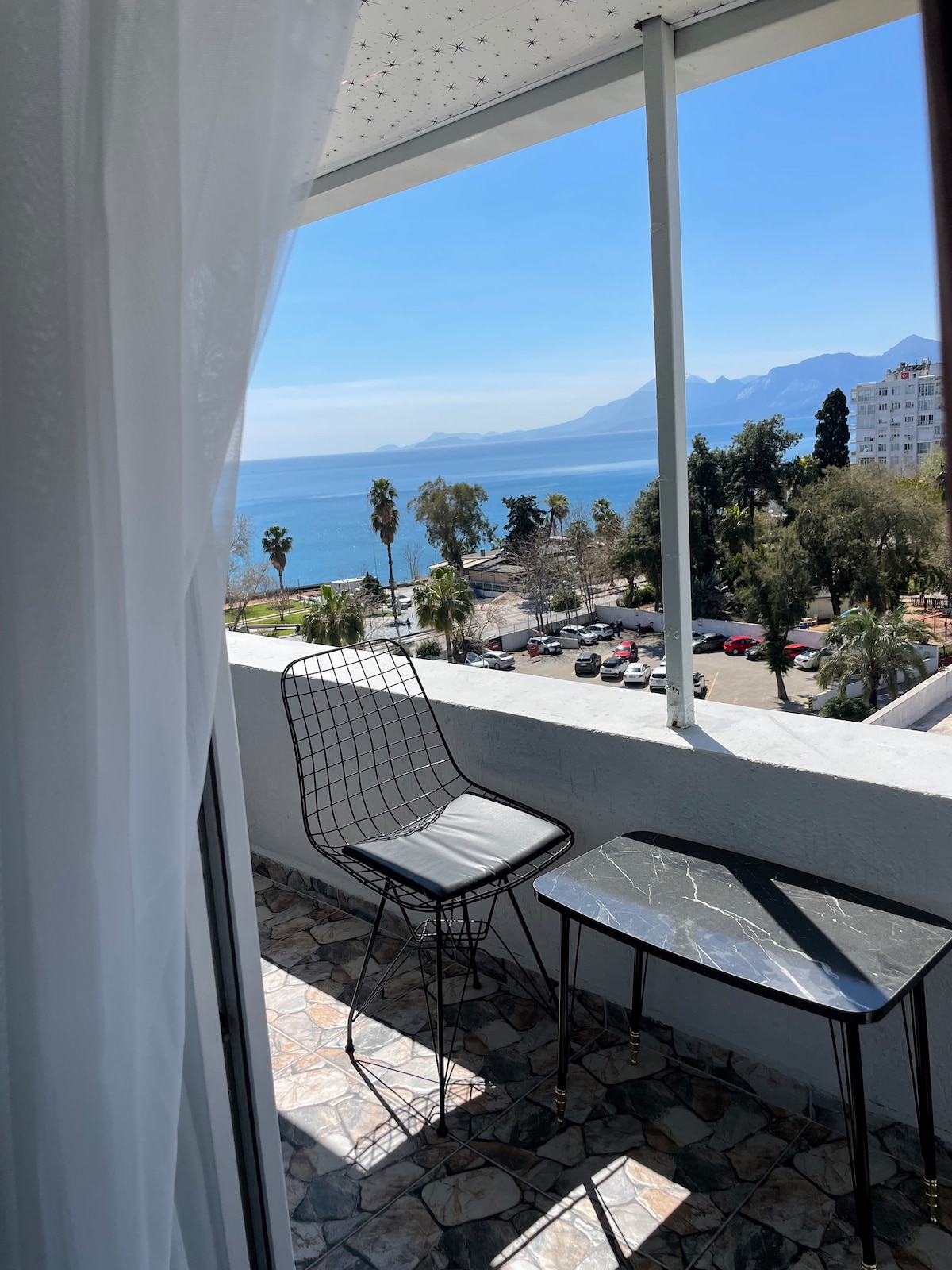 El nostre pis de dues habitacions i sisè pis té unes vistes espectaculars del port de la ciutat vella i del mar, una cosa que la majoria d'hotels de Kaleici no poden oferir. Cada dormitori té capacitat per a dues persones i un dels dormitoris té accés a una terrassa. Hi ha una cuina petita i ben equipada i una sala d'estar i un menjador que donen a una generosa terrassa. Aquest pis lluminós i espaiós està ben equipat i és una opció ideal per a les persones que volen gaudir d'unes vistes espectaculars del casc antic i de la costa.