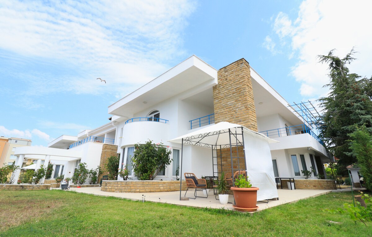 M'encantaria convidar-te a la meva vil·la El teu grup de fins a 10 adults s'allotjarà còmodament als 4 dormitoris d'aquest espaiós allotjament, situat en una ubicació única a la vora del mar. Respira la brisa marina al jardí espaiós i ben cuidat amb barbacoa, mentre que el pàrquing privat i els terrenys tancats garanteixen la seguretat del teu cotxe. Aquest lloc tranquil i apacible t'ofereix l'oportunitat de gaudir plenament de les sortides i les postes de sol, dels colors del jardí i del parc, de la sorra groga i del mar Negre.