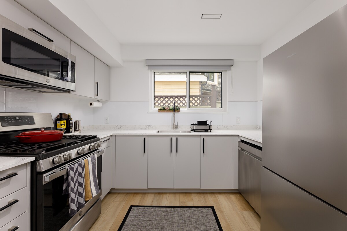 Gaudeix d'una estada de luxe i còmoda en aquest barri lluminós, apte per a famílies, segur i cèntric. Mida del llit: llit doble complet A poca distància a peu de trànsit, senders, parcs, botigues de comestibles, Kensington Plaza + molt més! A 20 minuts en cotxe del centre de la ciutat i a només 5 minuts en cotxe del centre comercial The Amazing Brentwood Mall. A poca distància a peu (a l'altre costat del carrer) de les rutes d'autobús a SFU + BCIT: autobús #144 + R5 SFU : 6 minuts en cotxe BCIT: 12 minuts en cotxe. Hi ha molts aparcaments disponibles al carrer. Càrrega EV disponible sota sol·licitud.