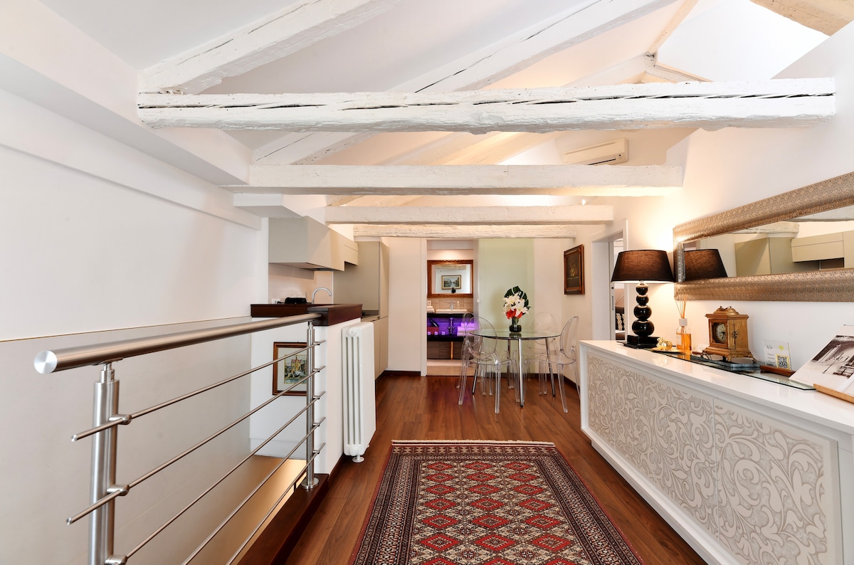 A Penthouse apartment with a unique charm, antique Venetian furniture and a big terrace with 360° view of Venice, including many church tops and even the tower of Saint Mark. Located in a historical 17th Century palace "Palazzo Gradenigo" in Rio Marin, one of the most romantic canals of the city in Santa Croce neighbourhood; With easy and fast access of a real short 5 minutes’ walk from the train station and Piazzale Roma (car or bus from the airport). Bright, romantic, historical.
