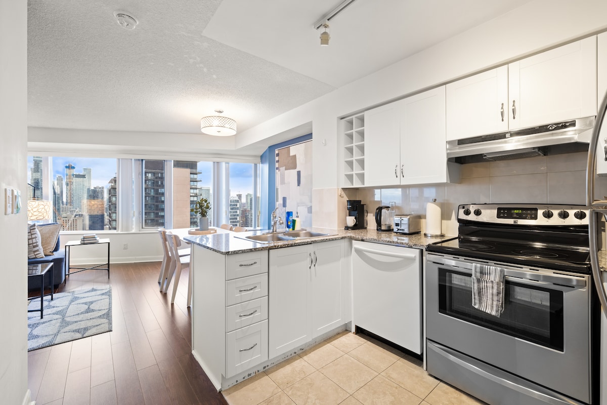 L'escapada perfecta al centre de Toronto! - Planta alta rara. Llit «king size» de luxe i sofà llit «queen size», bany complet, cuina completa, acollidora suite amb finestrals del terra al sostre amb una magnífica vista de l'horitzó de la ciutat. - Puntuació de 10/10 a peu fins a Eaton Center, Dundas Square, Ed Mirvish Theatre, Allan Gardens, Nathan Philips Square - A la línia de metro Yonge TTC: estació Queen, estació Dundas - Un passeig fins a Union Station, CN Tower, Lakeshore, Queen Street i King Street. - Accés al transport públic des del vestíbul de l'apartament.
