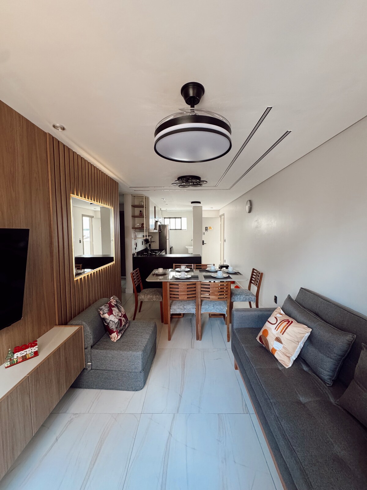 Segueix @ i dona un cop d'ull als vídeos del pis! El nostre pis té 90 m2 i està situat a la vora de Cabo Branco, amb les millors vistes de la ciutat. El pis consta de sala d'estar, cuina integrada i 100% equipada, un dormitori amb llit de matrimoni i aire condicionat, i una suite amb 2 llits queen i aire condicionat. Total de 2 banys al pis i 2 dormitoris, amb capacitat per a 6 persones. Tenim televisor intel·ligent, amb accés a Netflix i YouTube; wifi 500 mega i pany electrònic amb accés independent.