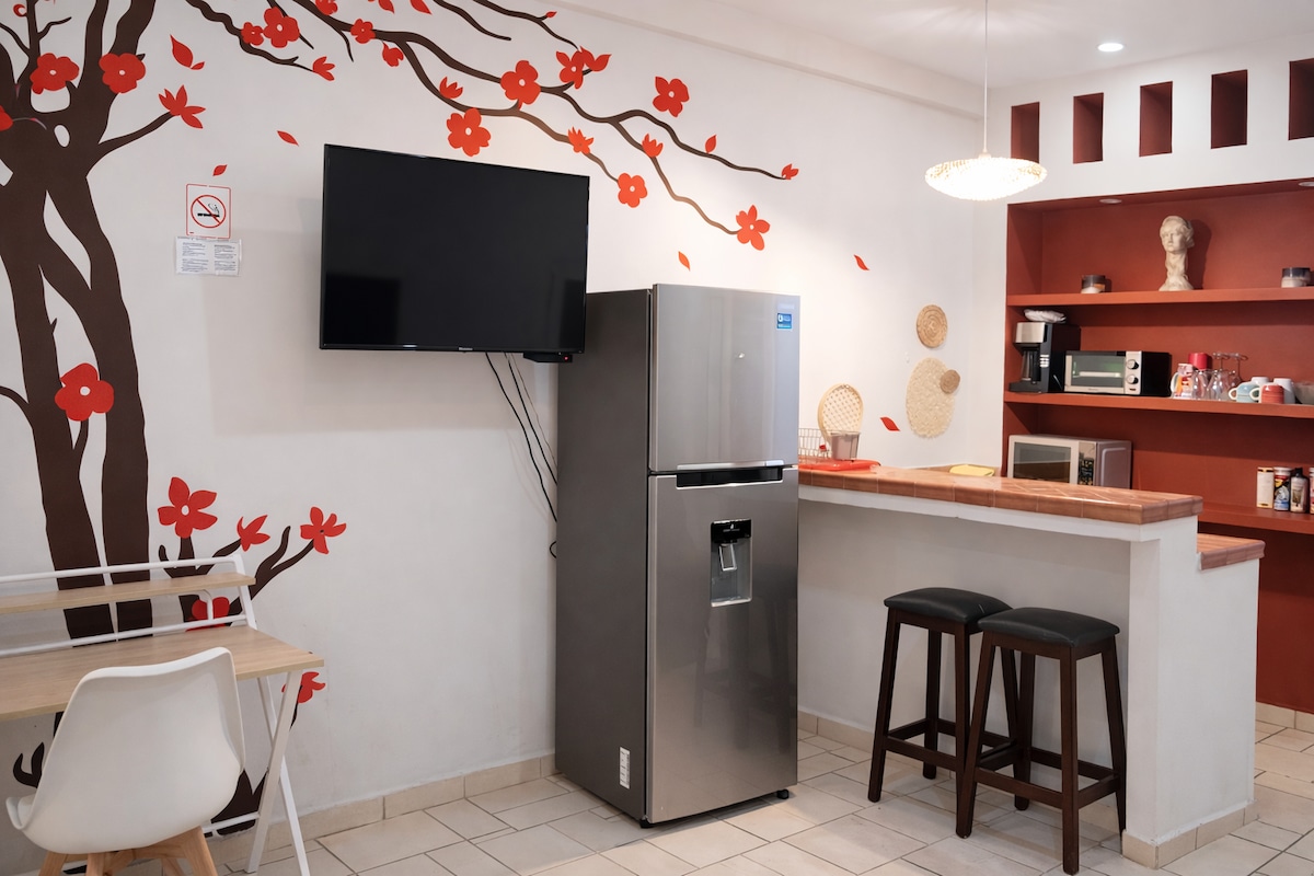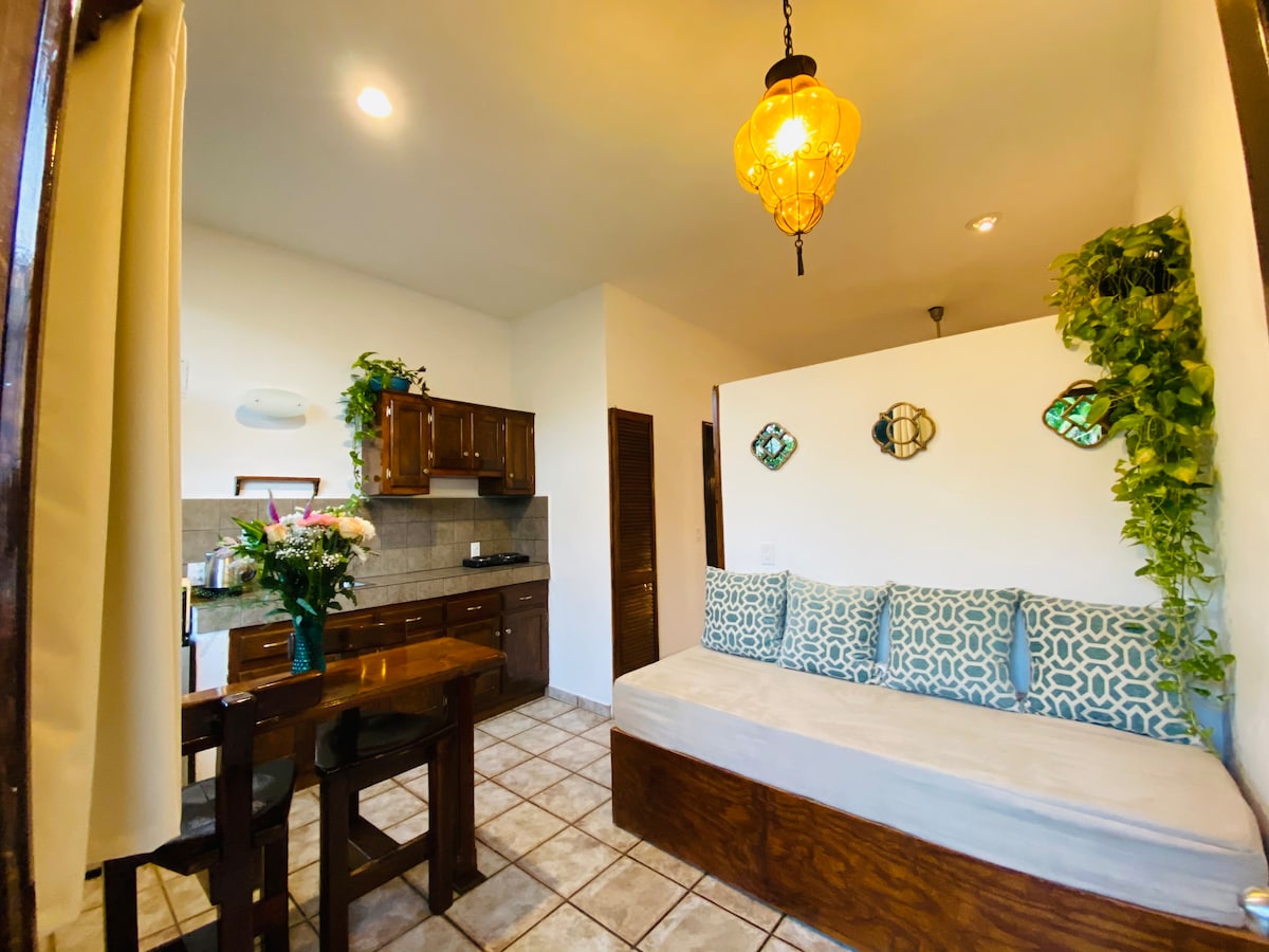 ✨ Spacious second-level apartment (220 sq ft) set in a lush tropical garden with over 40 fruit trees! Ideally located in the heart of downtown Cabo! Shops, restaurants and nightlife are all nearby! 5-min. walk to the marina and 15 min. walk to the beach 🏝️ ✅ Memory-foam mattress and blackout curtains for great sleep ✅ FREE private parking ✅ Private bathroom with amenities ✅ Private kitchen with appliances ✅ Complimentary coffee & tea ✅ TV featuring Netflix & YouTube ✅ In room safe