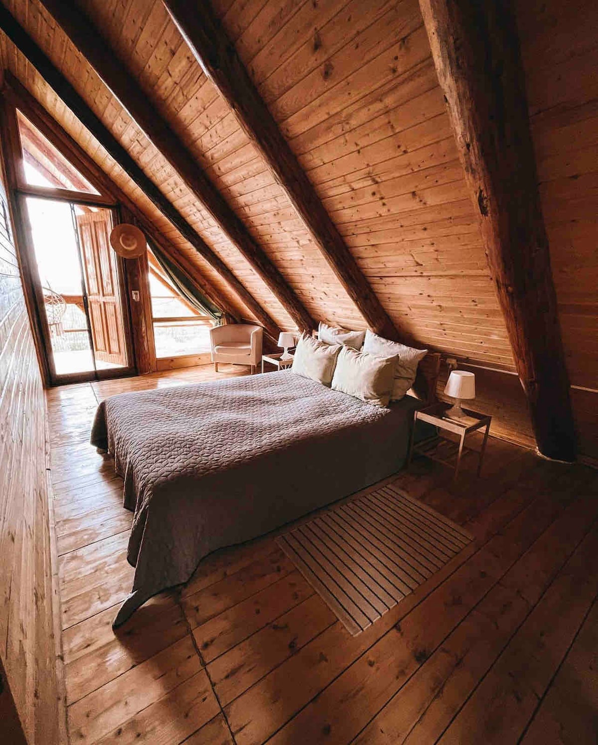 Tindràs: - sala d'estar de 20 m² + sofà doble - dormitori amb matalàs doble a la planta superior - llar de foc de llenya - bany de càmping (interior) - cafetera de filtre - bullidor d'aigua - fogons -nevera - barbacoa (hi trobaràs llenya/carbó) -plats - banyera - dutxa exterior amb aigua calenta (març-novembre) -lloc per a la foguera - bicicletes de muntanya