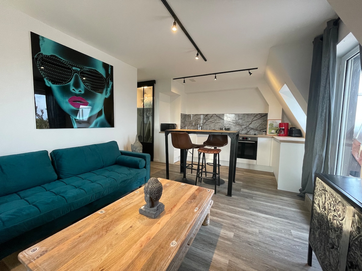 Gaudeix del nostre estudi amb balcó orientat al sud i banyera Balneo a la Marina. Està equipat amb un llit real de 160x200 amb llençols, wifi, televisor connectat, cuina equipada amb rentavaixelles, cafetera de cafè de gra ecològic amb molinet, te ecològic i sodastream, 1 ampolla de sidra local fresca de regal, wifi. Relaxa't al bany, equipat amb una banyera individual. El vàter està separat. Hi ha aparcament gratuït als peus de l'edifici.