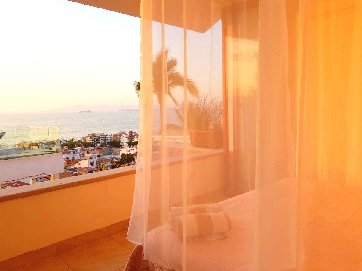Un espectacular loft PANORÀMIC AMB VISTES AL MAR a poca distància de la PLATJA i el Malecó, amb la teva pròpia PISCINA INFINITA +tots els serveis i comoditats, cuina totalment equipada, aire condicionat, llit de qualitat, dutxa amb cascada, wifi, televisor intel·ligent i les MILLORS VISTES per admirar POSTES DE SOL i FOCS ARTIFICIALS cada nit, fins i tot pots trobar algunes balenes esquitxant la badia des del llit! Camina fins a un munt de restaurants, botigues, galeries d'art, mercats o pren el sol als molts espais a l'aire lliure, piscines i terrasses... Et donem la benvinguda al paradís!