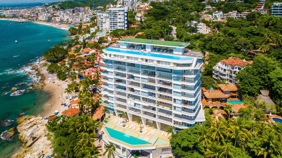Impressionant Orchid Corner Unit, 2Br, 2Ba, ofereix una vista impressionant de la badia de Bandares. Nou apartament d'estil resort de luxe que ofereix 2 piscines grans, gimnàs, restaurant i bar al terrat, neteja i seguretat les 24 hores. Finestres plegables que obren l'espai per complet, ubicat a Conchas Chinas. Accés directe a la platja, a poca distància a peu del centre de PV i de la platja de Los Muertos. Conserge personalitzat, recollida a l'aeroport, compres de comestibles, activitats, massatge de condomini i xef privat i molt més...