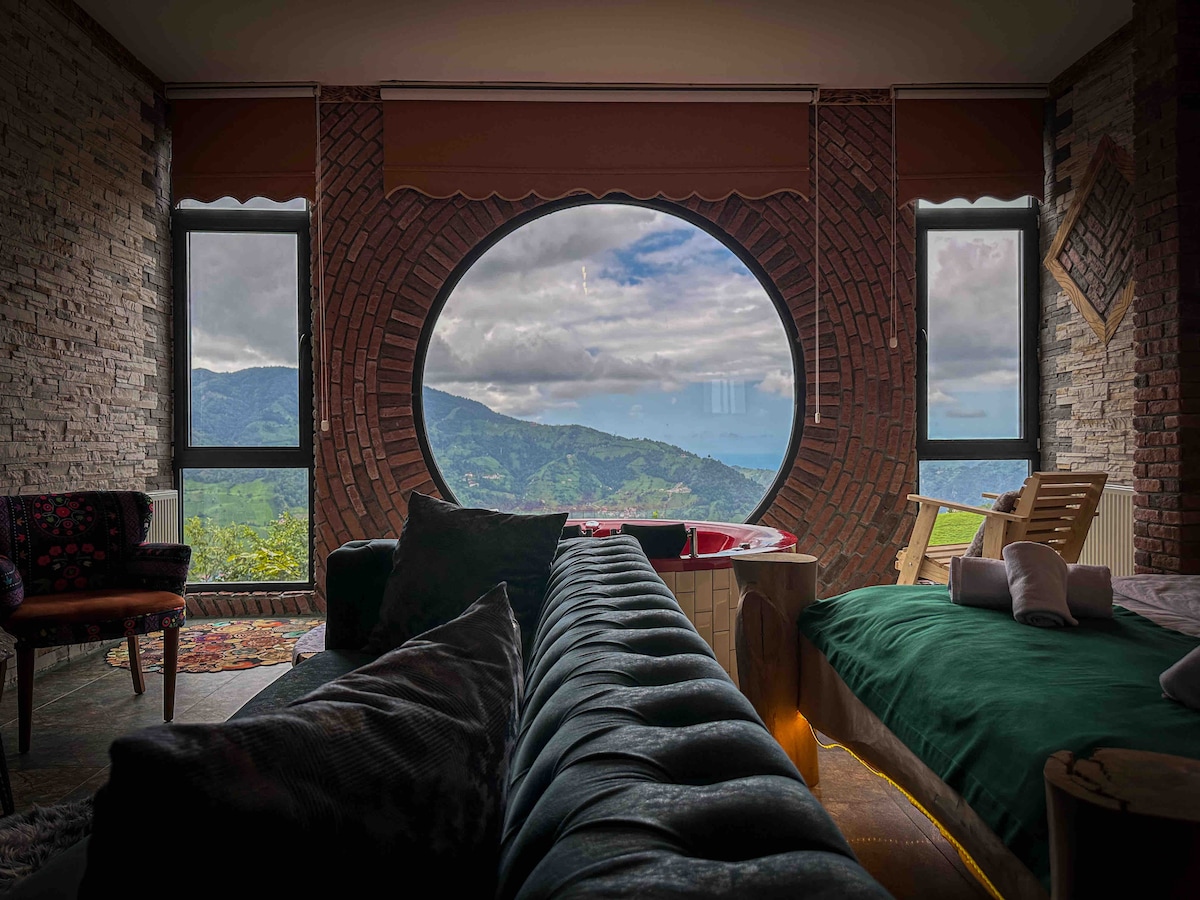 - La nostra sala de lluna de mel ha estat dissenyada de luxe i moderna. - La nostra habitació té un jacuzzi i, gràcies al detall de vidre circular, ofereix l'oportunitat de veure les magnífiques vistes de la vall i la muntanya. - És un concepte que les parelles de lluna de mel poden triar fàcilment. - La nostra habitació té banyera d'hidromassatge, butaca, grup de butaques, bany, televisor(Netflix), minibar i llit doble. - La nostra habitació és espaiosa i espaiosa i de 40 m2. - La nostra habitació amb banyera d'hidromassatge té un llit de fusta doble. - La pedra cultural moderna s'ha utilitzat com a disseny a la nostra habitació.
