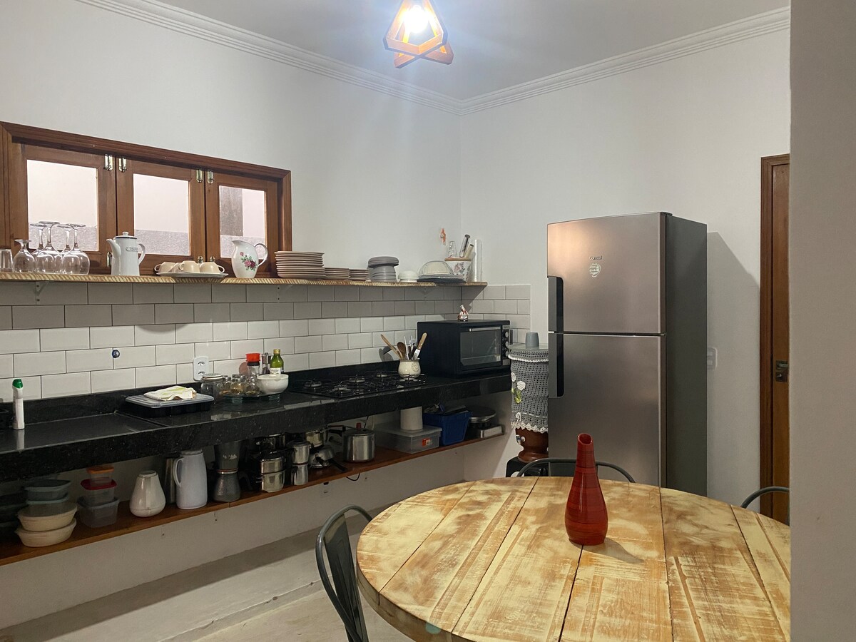 Relaxa't amb tota la família en aquest allotjament tranquil. Gaudeix d'una gran zona exterior, gespa, piscina, ideal per a nens i animals de companyia, així com de la terrassa de barbacoa, graella, broquetes, cuina amb nevera, fogao, microones, batedora, sandvitxera, olles, plats, coberts, xicaras i gots, i la comoditat de 3 suites amb aire condicionat per dormir restaurador. Desperta't amb el vent a la palla dels cocoters o mira les estrelles de nit i escolta la pau d'aquest lloc.