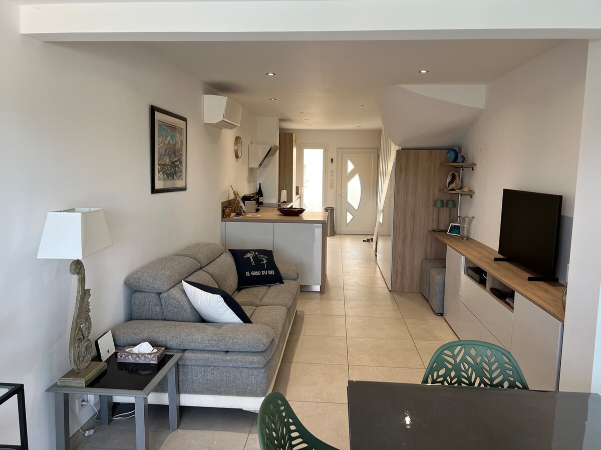 La nostra casa està situada en un carrer tranquil, a 1 km de les muralles d'Aigues Mortes i a 100 metres dels camins de la Camarga. La casa de 40 m2 es compon d'una sala d'estar amb cuina equipada i zona d'estar, i un dormitori per a 2 persones (llit doble) i bany amb dutxa. i una terrassa de 6 m2. Hi ha un matalàs inflable doble. - Aparcament privat gratuït davant de l'entrada - llençols/tovalloles i neteja NO INCLOSOS Si no hi ha cap opció, hauràs de fer la neteja pel teu compte.