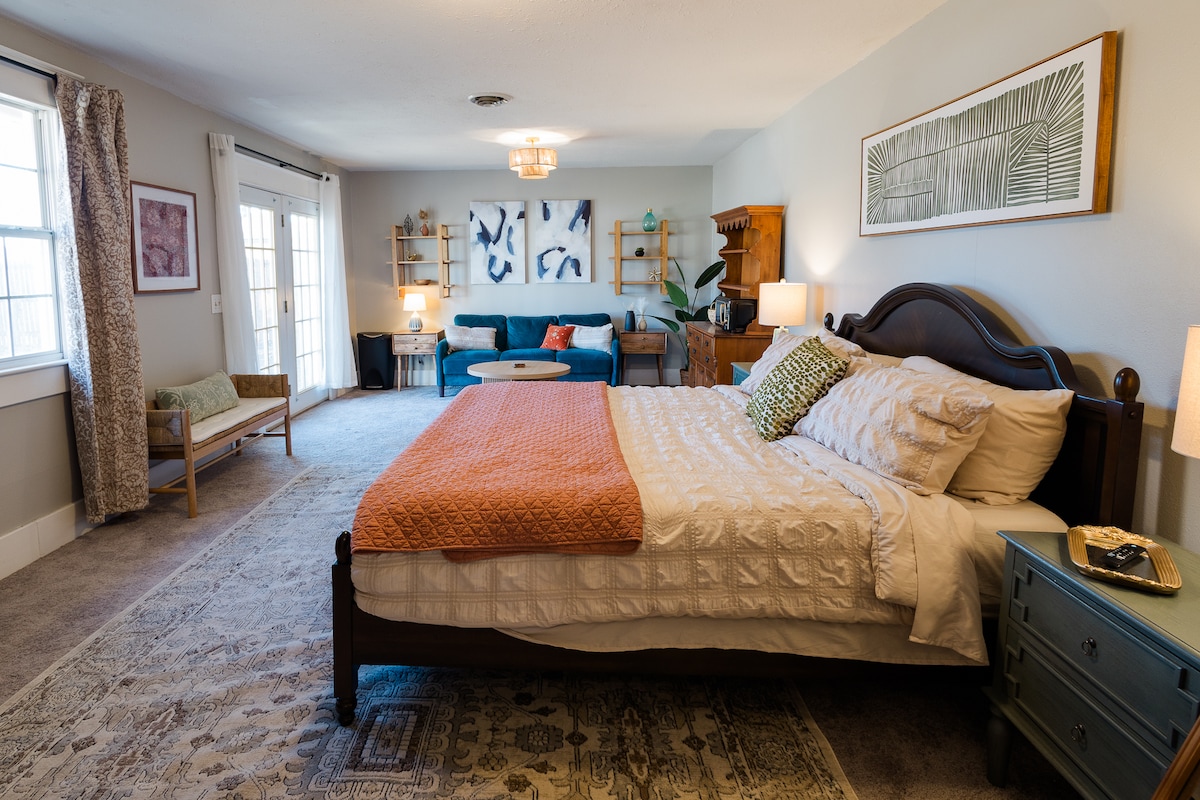 Gaudeix d'una escapada relaxant per a dues persones al nostre nou bungalou. El disseny de l'estudi disposa de tot el que necessites en un espai còmode: un llit king amb roba de llit de cotó blanc fresc i coixins de luxe, cadires còmodes per gaudir de la llar de foc i la televisió, menjador íntim i una cuina elegant. La banyera disposa d'un tocador doble, banyera per a dos i dutxa moderna. Hi ha un joc de bugaderia de mida completa a prop de la porta del darrere. El pati del darrere disposa d'una pèrgola de cedre amb banyera d'hidromassatge, una zona d'estar i una barbacoa de gas.
