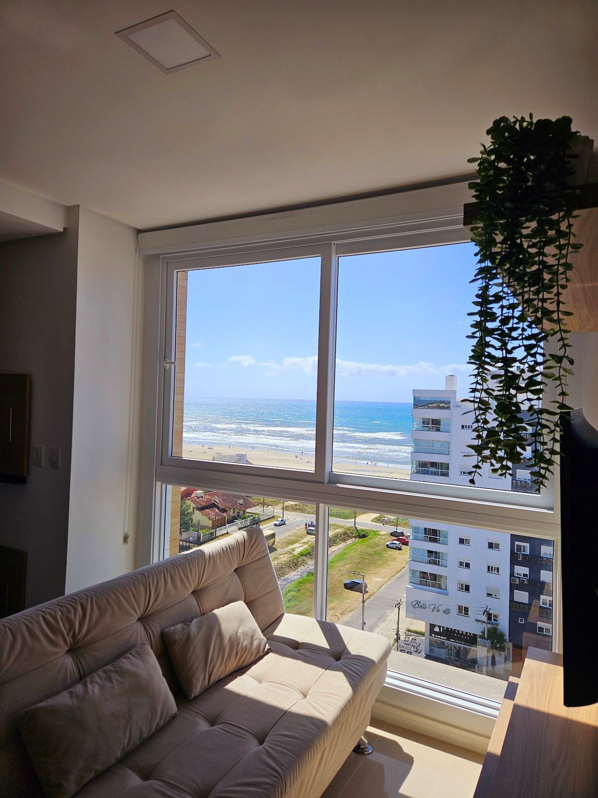 Pis modern, davant de la platja amb vistes al mar, situat en un apartament amb un cuidador. Molt ben situat, al costat de la Praça do Farol, al centre de Capão amb tots els serveis. A prop hi ha dos llocs petits. Disposa d'una plaça per a cotxes i aparcament tancat. Cuina molt pràctica amb cuina d'inducció, nevera/congelador, microones, cafetera i estris bàsics de cuina. Sala d'estar amb roba de llit, TV i internet wifi. Habitació amb 1 llit doble i 1 llit individual. Split: dormitori i sala d'estar.