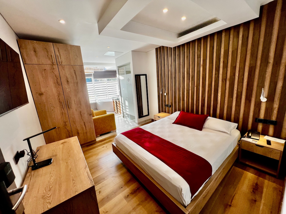 Nuestra habitación Suite Estelar está diseñada para ofrecerle exclusividad, seguridad, confort y lujo. Su decoración es original y esta acompañada de un conjunto de finos detalles;cuenta con mini bar,televisor led,chimenea y jacuzzi. En nuestro hotel contamos con espacio de trabajo,sala de lectura, rooftop,cafetin 24 horas,desayuno incluido, y parqueadero gratuito para los clientes