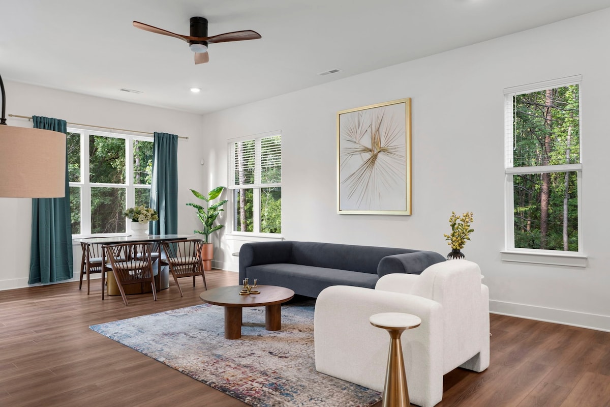 Gaudeix del luxe minimalista al nostre sofisticat allotjament d'1 nivell, perfectament situat a prop de SouthEnd, Uptown i l'aeroport internacional Charlotte Douglas. Aquesta elegant residència ofereix una barreja perfecta d'estil contemporani i la màxima comoditat, ideal per a una estada refinada a Queen City. L'espaiosa sala d'estar està equipada amb un gran televisor intel·ligent de 65", perfecte per relaxar-se o entretenir-se. La cuina gourmet compta amb electrodomèstics nous i taulells de quars, ideals per menjar sense esforç.