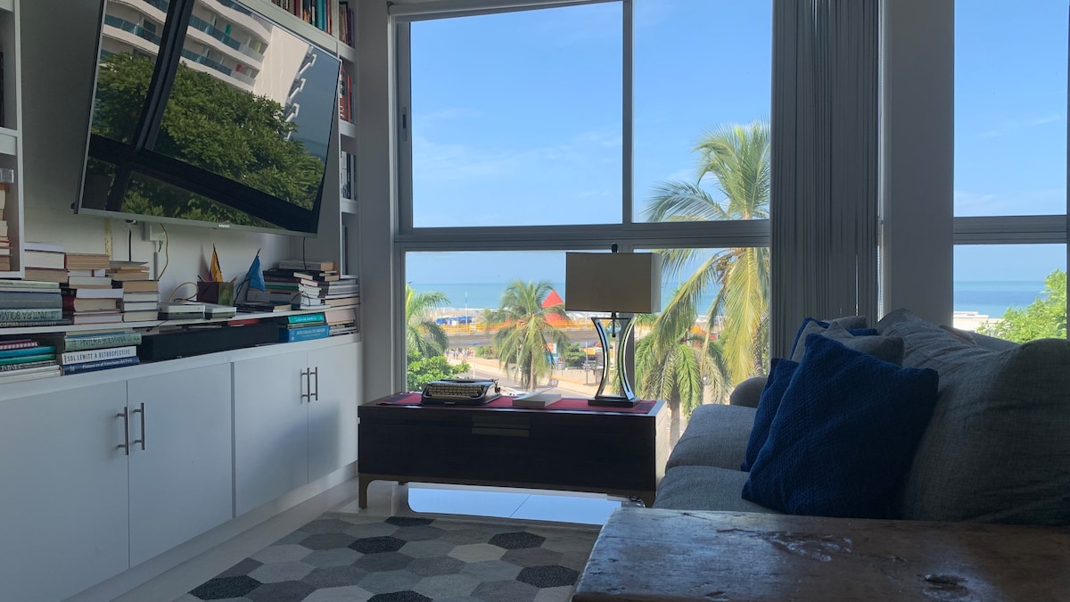 A brand new apartment (the building doesn't even show up in the maps online on the Internet yet, so please disregard the ugly pics there) with a million-dollar unobstructed view to the Caribbean Sea. This beachfront property is across the street from one of the best local beaches in Cartagena in an up-and-coming district / steps away from the Las Americas Convention Center. It´s also 5 minutes away from the airport, 10 minutes from the historic downtown and 1 minute or less away from the ocean.