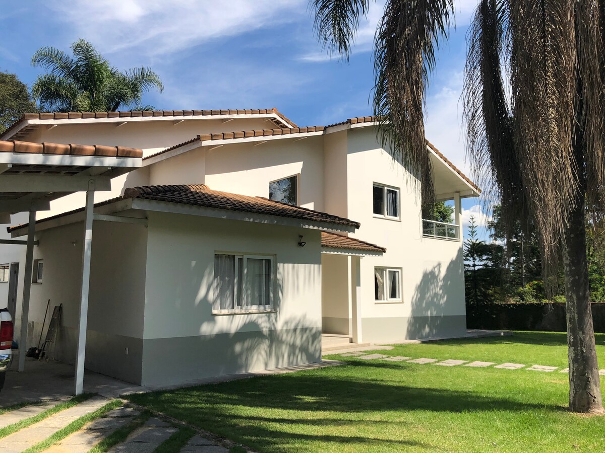 Linda casa, decoração clean, ampla e bem iluminada. Localizada em uma area de 1300m2, com varanda gourmet com churrasqueira e forno a lenha, de frente para uma area verde. Possui piscina privativa no terreno adjacente. Excelente para descansar e curtir com os amigos. A casa tem camas para dez pessoas, mais dois colchões no quarto e 02 colchões do sofá da varanda gourmet que poderão ser usados para possibilitar acomodar ate 14 pessoas