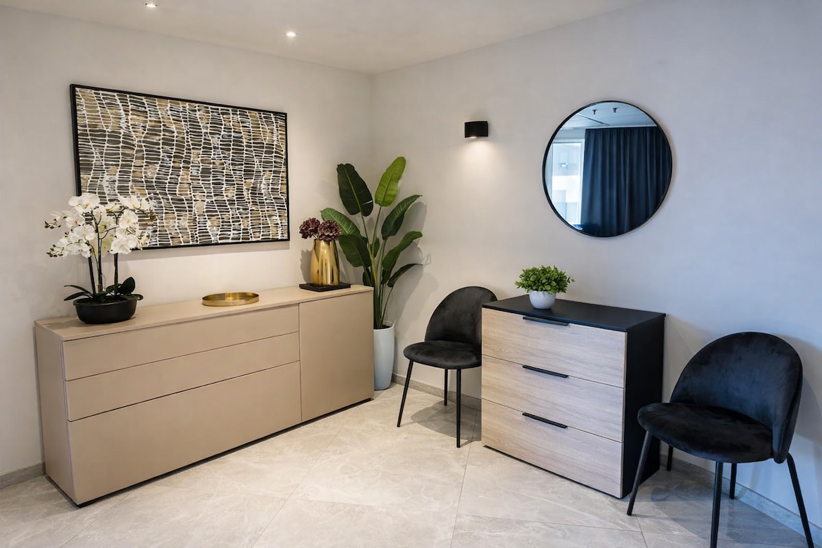 Apartament de disseny nou, a la planta 25 de les Mercury Towers de Zaha Hadid. Desperta't amb unes vistes impressionants del mar i de la ciutat des de tots els racons, incloent-hi el bany, el sofà, la taula de menjador o el balcó. Relaxa't en una cuina elegant i moderna amb copes de vi i cafetera, parets de marbre negre, televisor intel·ligent amb Netflix i seients a l'aire lliure. Gaudeix d'accés gratuït a les piscines del terrat i de la torre, al gimnàs i a l'espai termal; perfecte per a estades llargues o per a una escapada de luxe. Ens encantaria allotjar-te!