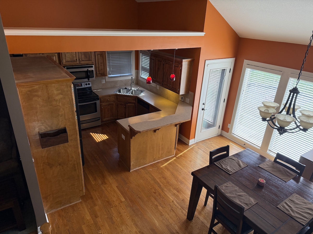 Oblida't de les preocupacions aquí! ★Tres llits King Size (sis persones), un sofà llit (dues persones) i 3 banys ★Gaudeix d'un disseny espaiós i acollidor que serà una casa meravellosa lluny de casa Aparcament ★privat al carrer davant de l'allotjament, molt fàcil accés Televisor Roku 4K de★ 55"a la sala d'estar i televisors Roku 4K de 50" a cada dormitori Estació de treball preparada per a★ portàtils ★ Pati i pati A ★1,7 milles de l'accés a l'autopista fins a l'àrea metropolitana de Kansas City ★5 camps de golf diferents a 15 minuts en cotxe