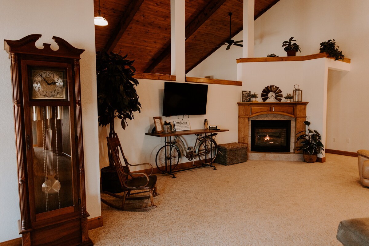 Et donem la benvinguda a la nostra espaiosa masia de 2 plantes, perfecta per a grups que visiten la zona de Kansas City. Situada entre 30 i 40 minuts cap al sud, amb accés directe per l’autopista, és un punt de partida ideal per assistir a esdeveniments i a la Copa Mundial de la FIFA 2026. Gaudeix d’una distribució oberta, una cuina totalment equipada, espais acollidors per reunir-te amb la gent i un porxo relaxant a la part davantera. Aquest allotjament es troba al costat de Stillmeadow, i la nostra cafeteria Cultivate és just a l’altra banda del carrer.