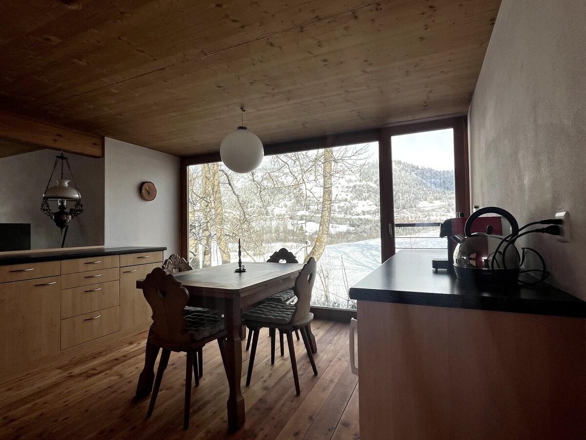 Relaxa't en aquest Rifugio únic. El 2020, un pis totalment reformat de 2 habitacions i mig, el disseny interior del qual va ser completament redissenyat. Construït com un loft amb els millors materials (Valser Granit, parquet del castell, molta fusta vintage, banyera independent, llar de foc de ferro oberta a dos costats, accessoris de disseny). Amb seients protegits al jardí i jardí. Ubicació assolellada i tranquil·la. Entrada privada a la casa, sauna a l'annex. Es pot arribar a l'esquí, a l'esquí o a l'autobús d'esquí en tres minuts.