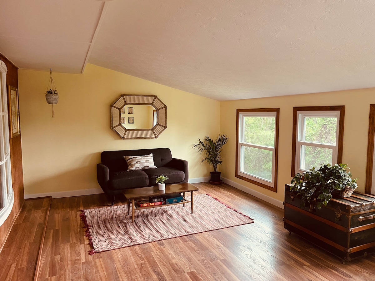 Unique country GuestHouse artistically renovated from a repurposed insulated tractor trailer. Private, quiet woodland setting under starry night skies. Brilliantly designed to maximize space for a bedroom- queen bed, desk area. Full bathroom, fully equipped kitchen, eating and lounging area, comfy loft with a sleeper sofa. The spacious sunny deck, shady patio, & fire pit bring your experience more outside. 1.6mi woodland trail. Turkeys, chickens, herb farm. Wifi. 10% discount for repeat guests.